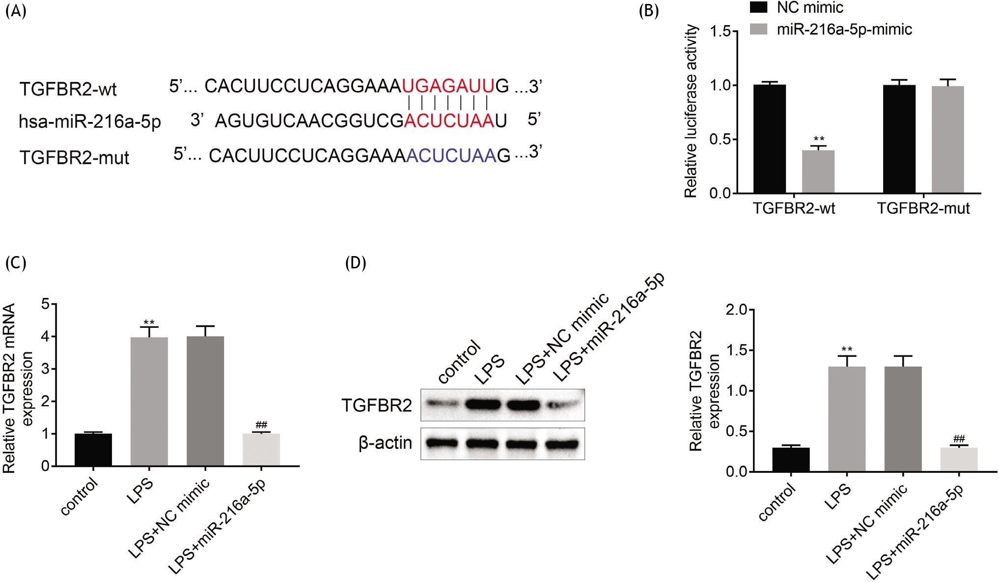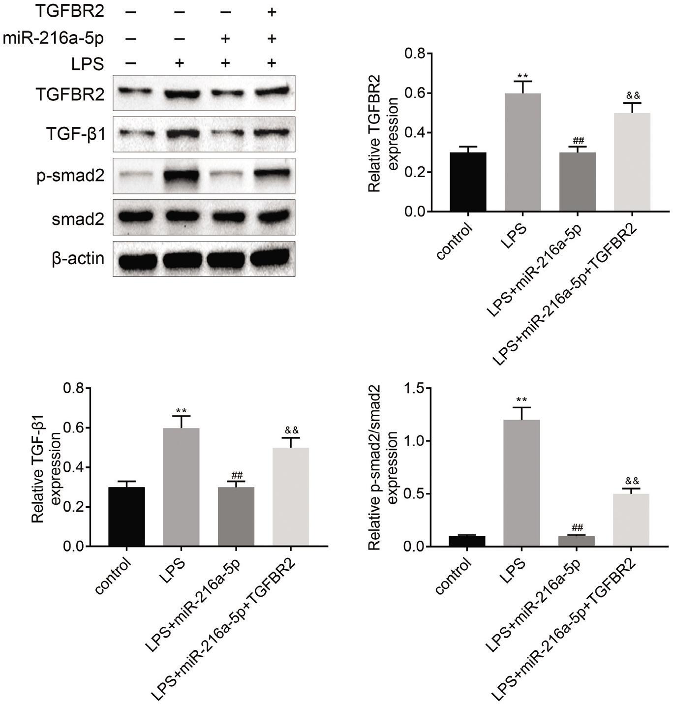 Results: miR-216a-5p gene expression decreased in BEAS-2B cells stimulated by LPS. Overexpression of miR-216a-5p suppressed the elevated levels of IL-1β, IL-6, and TNF-α induced by LPS. Transforming growth factor-beta receptor 2 (TGFBR2) proved to be a direct target of miR-216a-5p, and they negatively modulated TGFBR2 expression. In addition, overexpression of miR-216a-5p inhibited LPS-induced protein levels of TGFBR2,transforming growth factor (TGF)-β1, and phosphorylation of SMAD family member 2 (smad2),. This ectopic expression of miR-216a-5p was restored by overexpressed TGFBR2.