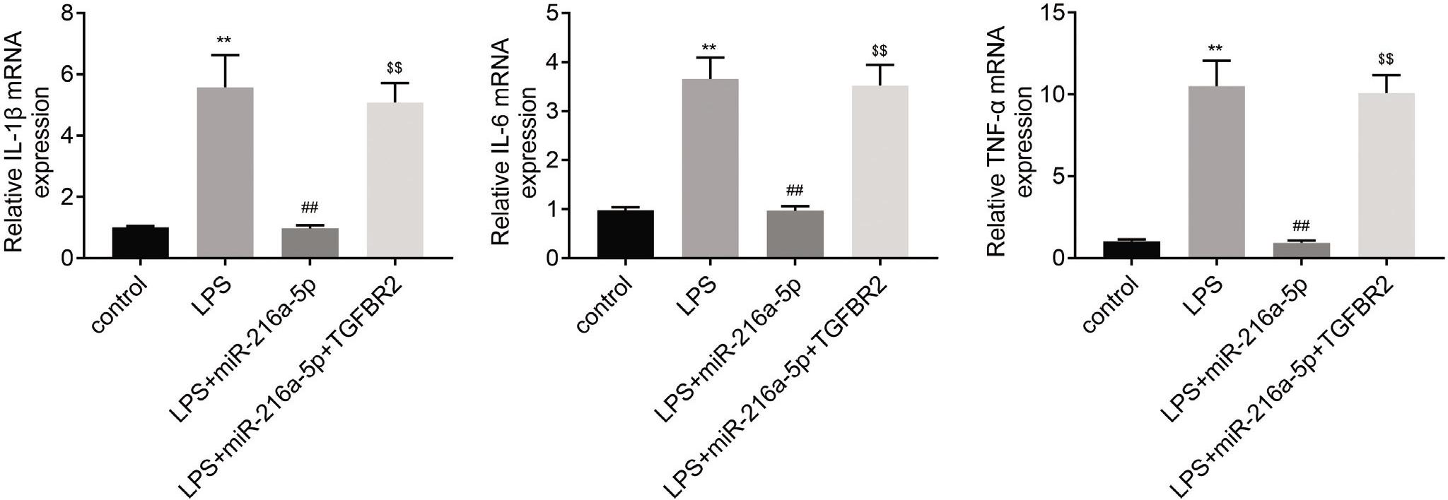 Figure 5 miR-216a-5p suppressed LPS-induced inflammation in BEAS-2B cells via regulating TGFBR2. qRT-PCR was used to determine the mRNA levels of IL-1β, IL-6, and TNF-α after BEAS-2B cells were transfected with miR-216a-5p mimic, TGFBR2 overexpression plasmid, and treated with LPS. The experiment was performed three times. **P < 0.01. ##P < 0.01.