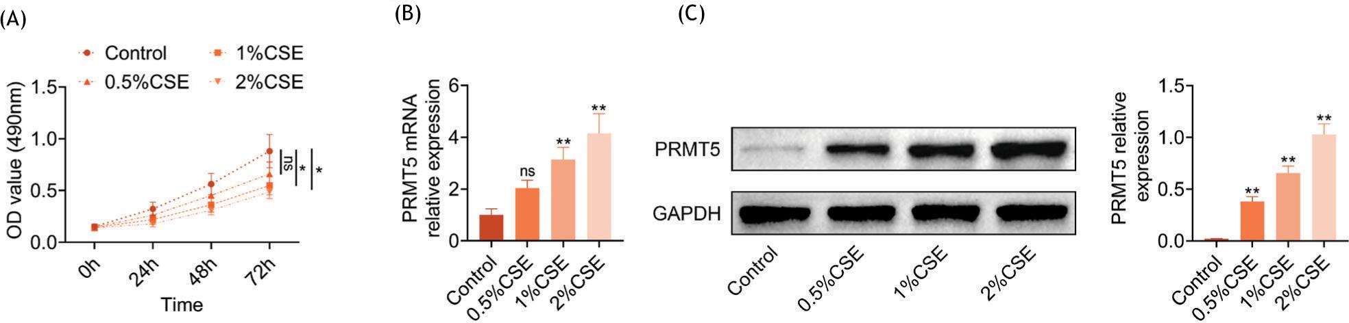 Figure 1 PRMT5 was up-regulated in cigarette smoke extract-induced 16HBE. (A) Treatment with cigarette smoke extract reduced the cell viability of 16HBE. (B) Treatment with cigarette smoke extract enhanced the mRNA expression of PRMT5 in 16HBE. (C) Treatment with cigarette smoke extract enhanced the protein expression of PRMT5 in 16HBE. *, ** vs. control, P < 0.05, P < 0.01.