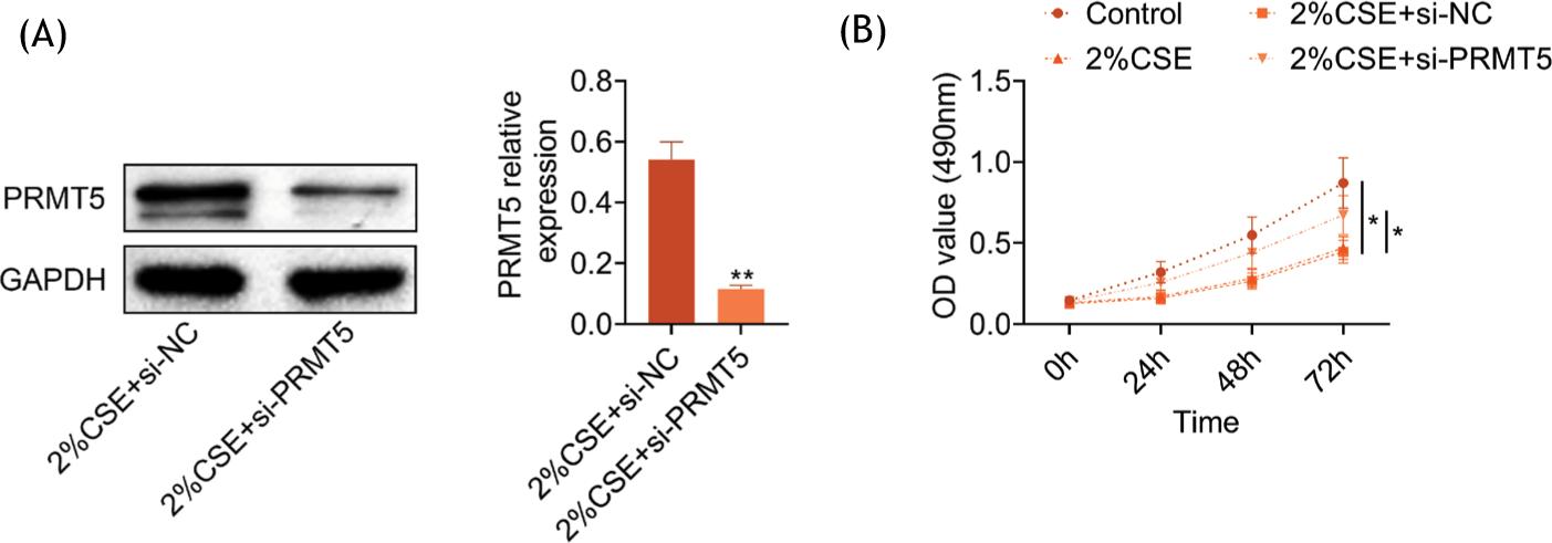 Figure 2 Down-regulation of PRMT5 increased cell viability of cigarette smoke extract-induced 16HBE. (A) Transfection with si-PRMT5 reduced the protein expression of PRMT5 in cigarette smoke extract-induced 16HBE. (B) Transfection with si-PRMT5 promoted cell viability of cigarette smoke extract-induced 16HBE. *, ** vs. 2% CSE + si-NC, P < 0.05, P < 0.01.