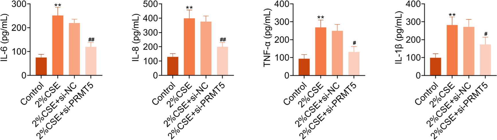 Figure 3 Down-regulation of PRMT5 suppressed cigarette smoke extract-induced inflammation in 16HBE. Knockdown of PRMT5 decreased IL-6, IL-8, TNF-α, and IL-1β levels in cigarette smoke extract-induced 16HBE. ** vs. control, P < 0.01. #, ## vs. 2% CSE + si-NC, P < 0.05, P < 0.01.