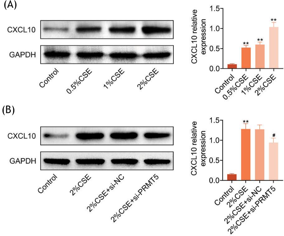 Figure 4 CXCL10 was up-regulated in cigarette smoke extract-induced 16HBE. (A) Treatment with cigarette smoke extract enhanced protein expression of CXCL10 in 16HBE. (B) Knockdown of PRMT5 decreased CXCL10 expression in cigarette smoke extract-induced 16HBE. ** vs. control, P < 0.01. # vs. 2% CSE + si-NC, P < 0.05.
