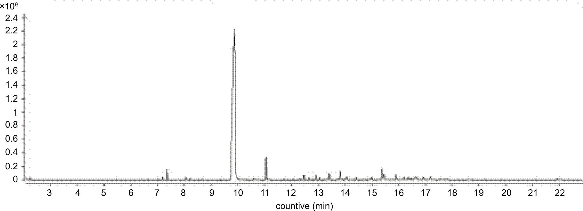 GC-MS detection conditions23: An Agilent HP-5 capillary column (0.25mm × 15m, 0.25mm) was used. The injection volume was taken as 1 mL, with a flow rate of 1 mL·min-1. The split ratio was considered as 10:1. The forward sample temperature was set as 250°C. The auxiliary heating temperature was 280°C. The programmed temperature was set as follows: an initial temperature of 50°C, held for 2 min, and raised to 230°C at the rate of 10°C / min, contained for 3 min. The total analysis time was 23 min, the temperature of the ion source 230°C, and the temperature of the four-stage rod 150°C. The scanning range was m/z 35-590, and the solvent delay time was set as 2 min.