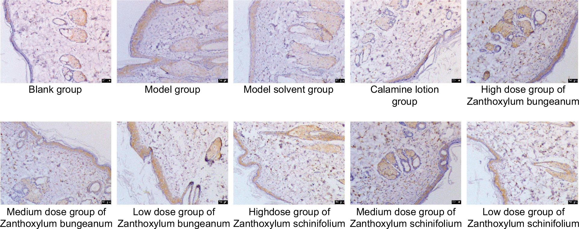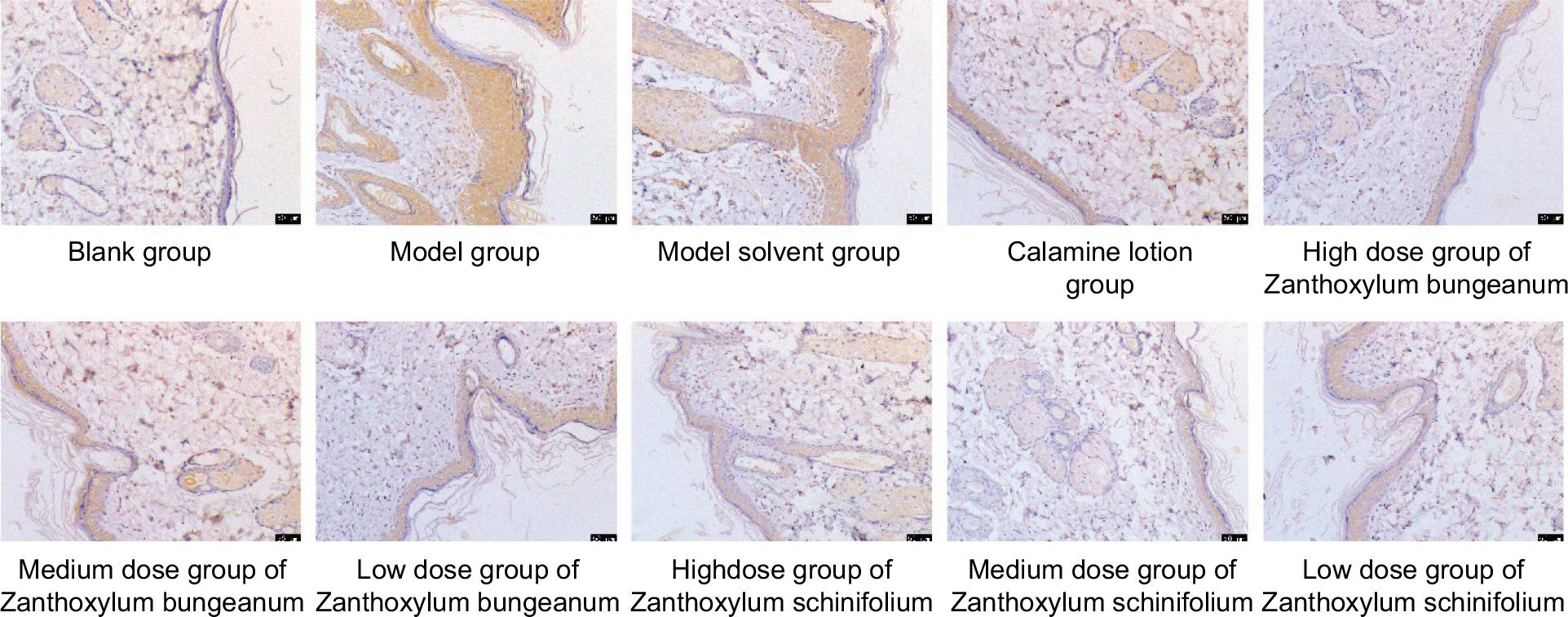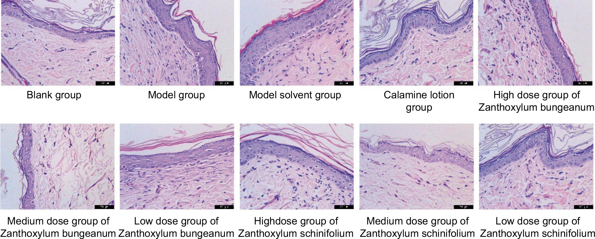 Compared with the model group, the hyperkeratosis, edema, and infiltration in the calamine lotion group, the medium dose group of Zanthoxylum bungeanum and Zanthoxylum schinifolium were significantly lower, which indicated that the medium dose group of Zanthoxylum bungeanum and Zanthoxylum schinifolium could significantly improve the pathological morphology.