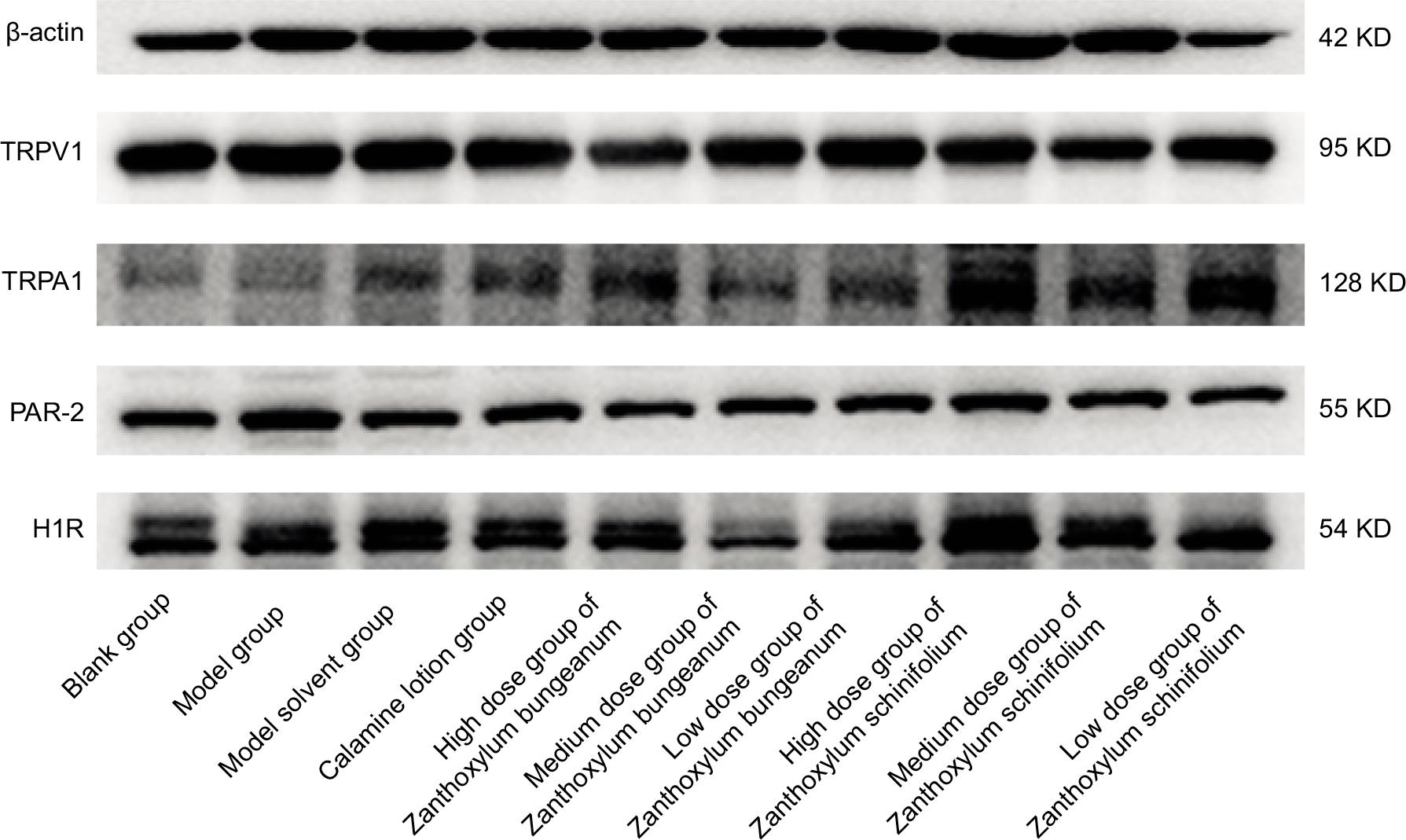 Compared with the blank group, the expression of H1R in the model group was upregulated. Compared with the model group, the expression of H1R in the calamine lotion group, the medium-dose group of Zanthoxylum bungeanum, and Zanthoxylum schinifolium was significantly down-regulated. Compared with the blank group, the expression of PAR-2 in the model group was up-regulated. Compared with the model group, the expression of PAR-2 in the calamine lotion group, high-dose group of Zanthoxylum bungeanum, and the low-dose group of Zanthoxylum schinifolium was significantly down-regulated; when compared with the blank group, the expression of TRPV1 in the model group was up-regulated. Compared with the model group, the expression of TRPV1 in the high-dose group of Zanthoxylum bungeanum was significantly down-regulated. Compared with the blank group, the expression of TRPV1 in the model group had no significant change.