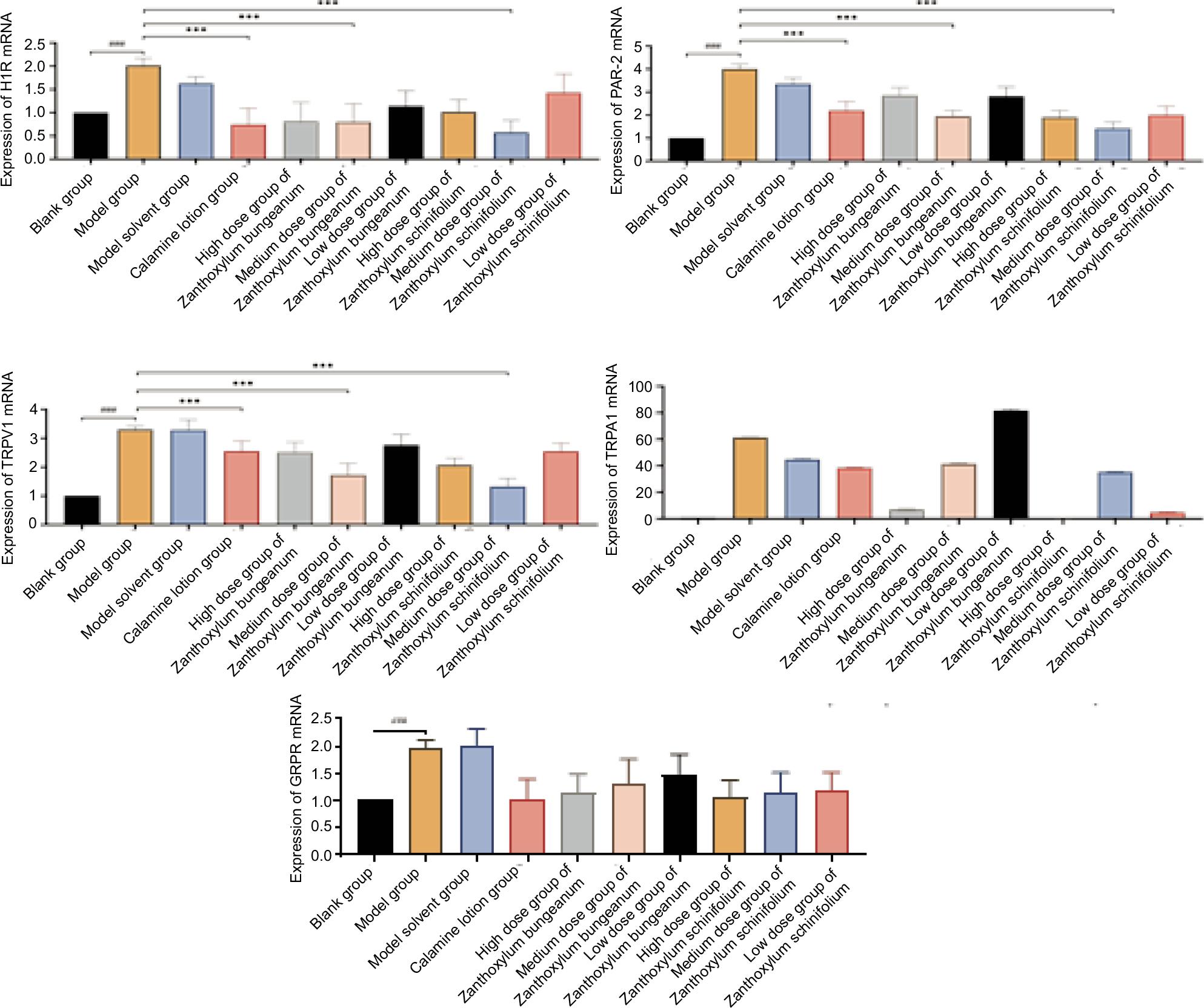Compared with the blank group, the expression of H1R in the model group was significantly up-regulated, and compared with the model group, the expression of H1R in the calamine lotion group, medium-dose group of Zanthoxylum bungeanum, and Zanthoxylum schinifolium were significantly down-regulated. Compared with the blank group, the expression of PAR-2 in the model group was significantly up-regulated. Compared with the model group, the expression of PAR-2 in the calamine lotion group, the medium-dose group of Zanthoxylum bungeanum, and Zanthoxylum schinifolium were significantly down-regulated. Compared with the blank group, the expression of TRPV1 in the model group was significantly up-regulated. In comparison with the model group, the expression of TRPV1 in the calamine lotion group, medium-dose group of Zanthoxylum bungeanum, and Zanthoxylum schinifolium were significantly down-regulated. Compared with the blank group, the expression of TRPA1 in the model group was significantly up-regulated, and with the model group, the expression of TRPA1 in the calamine lotion group, high-dose group of Zanthoxylum bungeanum and Zanthoxylum schinifolium were significantly down-regulated. Compared with the blank group, the expression of GRPR in the model group was significantly up-regulated. In comparison with the model group, the expression of GRPR in the calamine lotion group, the high-dose group of Zanthoxylum bungeanum and Zanthoxylum schinifolium were significantly down-regulated.