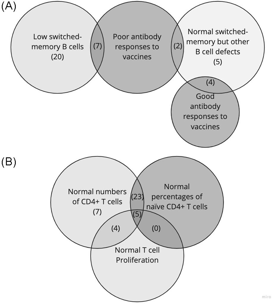 Figure 1 Evaluation of humoral and celular immune responses in our CVID census. Numbers in parentheses indicate the number of patients with the corresponding feature.