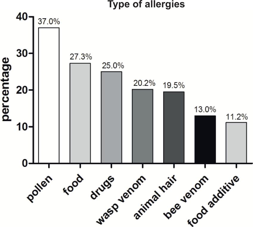 Figure 1 Allergy entities of the patient collective. Pollen (36.2%), food (26.7%), drugs (24.2%), wasp venom (20.1%), animal hair (19.4%), bee venom (12.9%), and food additive (10.9%), Total (n) = 579.