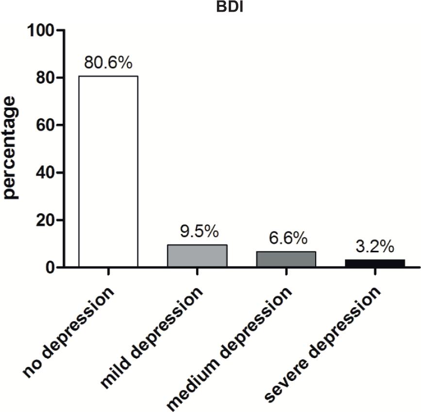 Figure 2 Depression rate of the patient collective. None (80.6%), mild depression (9.5%), medium depression (6.6%), and severe depression (3.2%), Total (n) = 527.