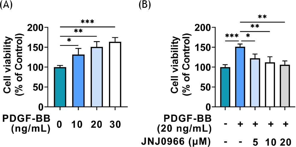 Figure 1 JNJ0966 weakened the cell activity of PDGF- BB-induced ASMCs. (A) The cell viability was examined through MTT assay in ASMCs induced by different concentrations of PDGF-BB (0, 10, 20 and 30 ng/mL). (B) The cell viability was detected through MTT assay in the Control, PDGF-BB, PDGF-BB+JNJ0966 (5 μM), PDGF-BB+JNJ0966 (10 μM), and PDGF-BB+JNJ0966 (20 μM) groups. *p˂0.05, **p˂0.01, ***p˂0.001.