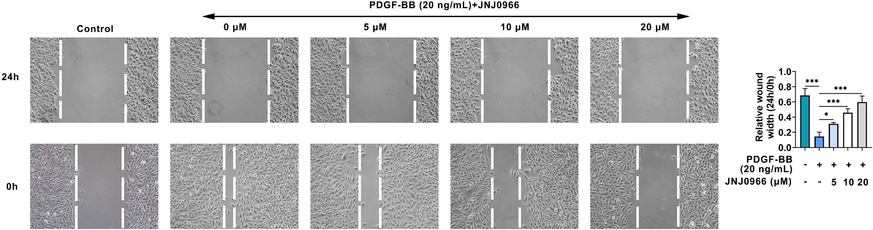 Figure 2 JNJ0966 reduced the migration ability of PDGF-BB-induced ASMCs. The cell migration ability was assessed through wound healing assay in the Control, PDGF-BB, PDGF-BB+JNJ0966 (5 μM), PDGF-BB+JNJ0966 (10 μM), and PDGF-BB+JNJ0966 (20 μM) groups. *p˂0.05, **p˂0.01, ***p˂0.001.