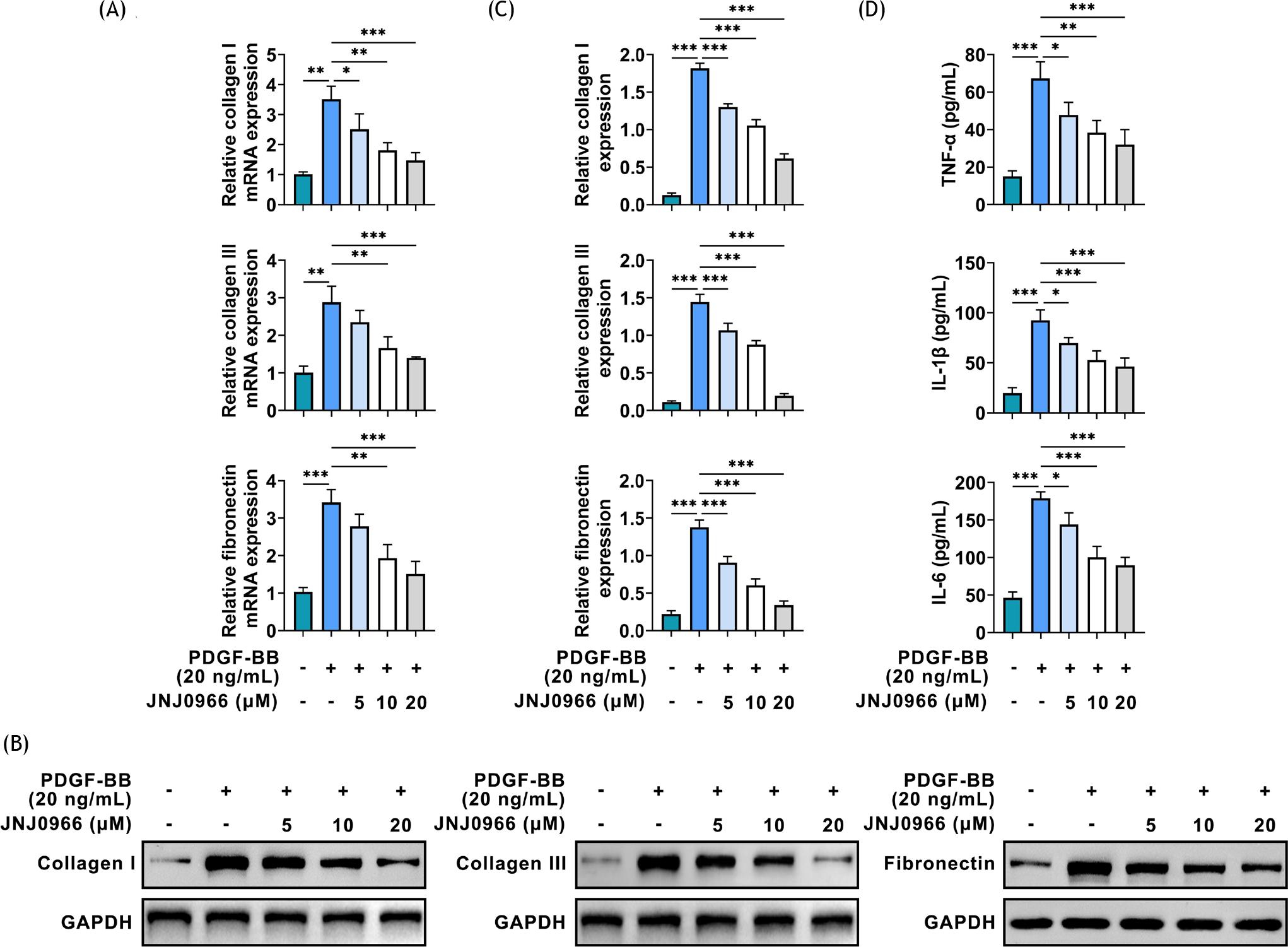 Further investigation showed that the mRNA expressions of collagen I, collagen III, and fibronectin were upregulated, but this effect was attenuated by treatment with JNJ0966 (Figure 3A). Similarly, the increased protein expressions of collagen I, collagen III, and fibronectin triggered by PDGF-BB (20 ng/mL) were reversed by JNJ0966 treatment (Figure 3B,C). Moreover, the enhanced levels of TNF-α, IL-1β, and IL-6 were attenuated by JNJ0966 treatment (Figure 3D). These above data revealed that JNJ0966 relieved the ECM deposition in PDGF-BB-induced ASMCs.