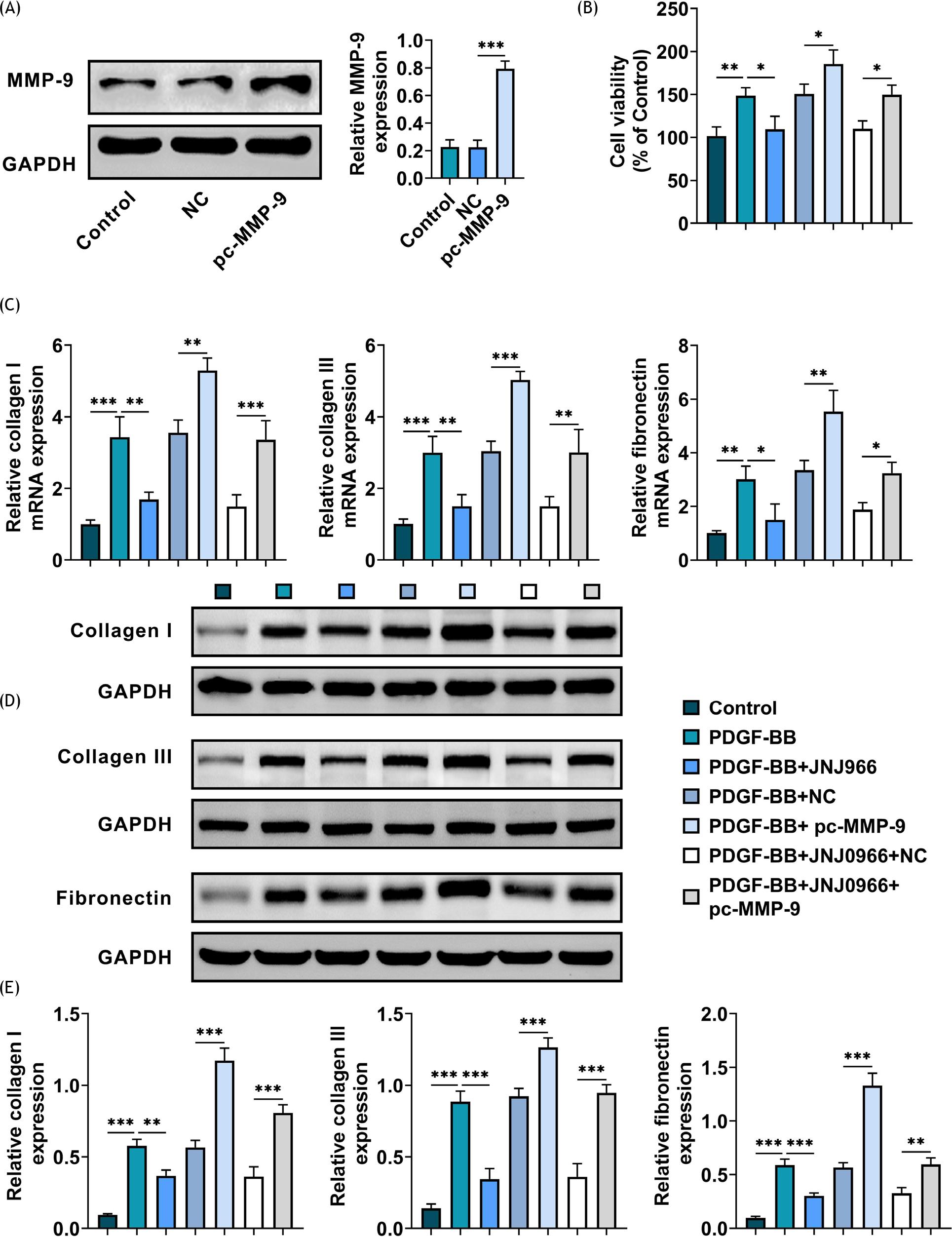 Figure 4 Overexpression of MMP-9 reversed the inhibition of JNJ0966 on cell viability and ECM deposition in ASMCs. (A) Protein expression of MMP-9 was assessed through western blot after overexpressing MMP-9. (B) The cell viability was measured through MMT assay. (C) The mRNA expressions of collagen I, collagen III and fibronectin were measured through RT-qPCR. (D,E) Protein expressions of collagen I, collagen III, and fibronectin were detected through western blot. Groups were divided into the Control, PDGF-BB, PDGF-BB+JNJ0966, PDGF-BB+NC, PDGF-BB+pc-MMP-9, PDGF-BB+JNJ0966+NC, or PDGF-BB+JNJ0966+pc-MMP-9 group. PDGF-BB: 20 ng/mL; JNJ0966: 10 μM. *p˂0.05, **p˂0.01, ***p˂0.001.