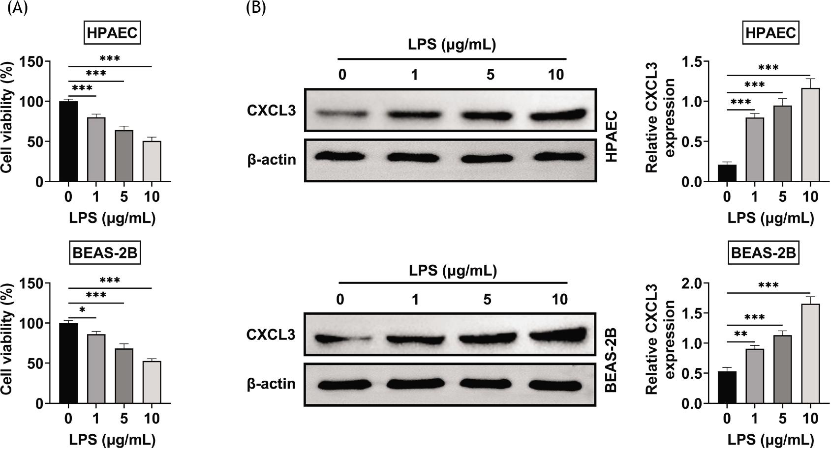 Figure 1 Lipopolysaccharides caused the upregulation of CXCL3 in BEAS-2B and HPAE cells. (A) The viabilities of BEAS-2B and HPAE cells were reduced by lipopolysaccharides in a dose-dependent manner. (B) The protein expression of CXCL3 in BEAS-2B and HPAE cells was enhanced by lipopolysaccharides in a dose-dependent manner. *, **, ***, P ˂ 0.05, P ˂ 0.01, P ˂ 0.001. BEAS-2B, human lung epithelial cells; CXCL3, C-X-C motif chemokine ligand 3; HPAEC, human pulmonary artery endothelial cells.
