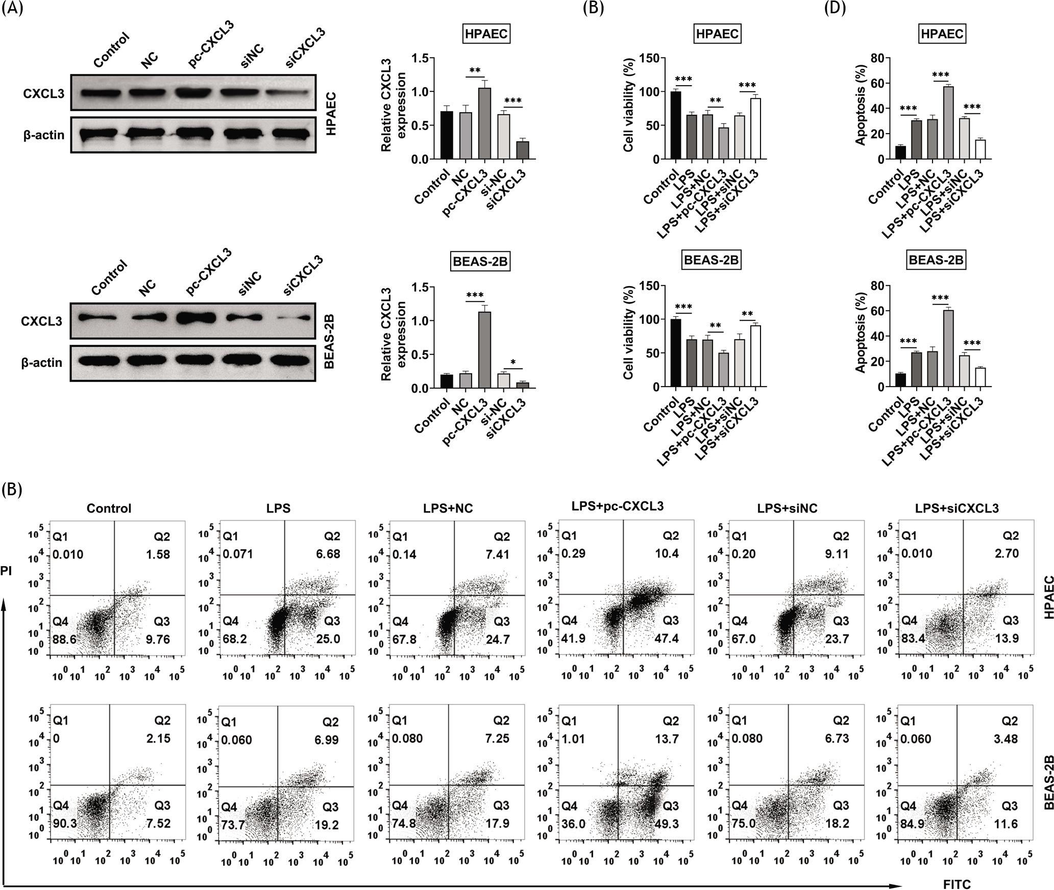 Figure 2 Knockdown of CXCL3 inhibited the apoptosis of LPS-treated BEAS-2B and HPAE cell lines. (A) Transfection with pc-CXCL3 or siCXCL3 increased or decreased the protein expression of CXCL3 in BEAS-2B and HPAE cells, respectively. (B) Overexpression of CXCL3 reduced the viabilities of LPS-treated BEAS-2B and HPAE cell lines, while knockdown of CXCL3 caused the opposite results. (C) Overexpression of CXCL3 promoted the apoptosis of LPS-treated BEAS-2B and HPAE cell lines, while knockdown of CXCL3 caused the opposite results. (D) Relative apoptosis of LPS-treated BEAS-2B and HPAE cell lines after transfection of pc-CXCL3 or siCXCL3, respectively. *, **, ***, P ˂ 0.05, P ˂ 0.01, P ˂ 0.001. BEAS-2B, human lung epithelial cells; CXCL3, C-X-C motif chemokine ligand 3; HPAEC, human pulmonary artery endothelial cells; LPS, lipopolysaccharides.