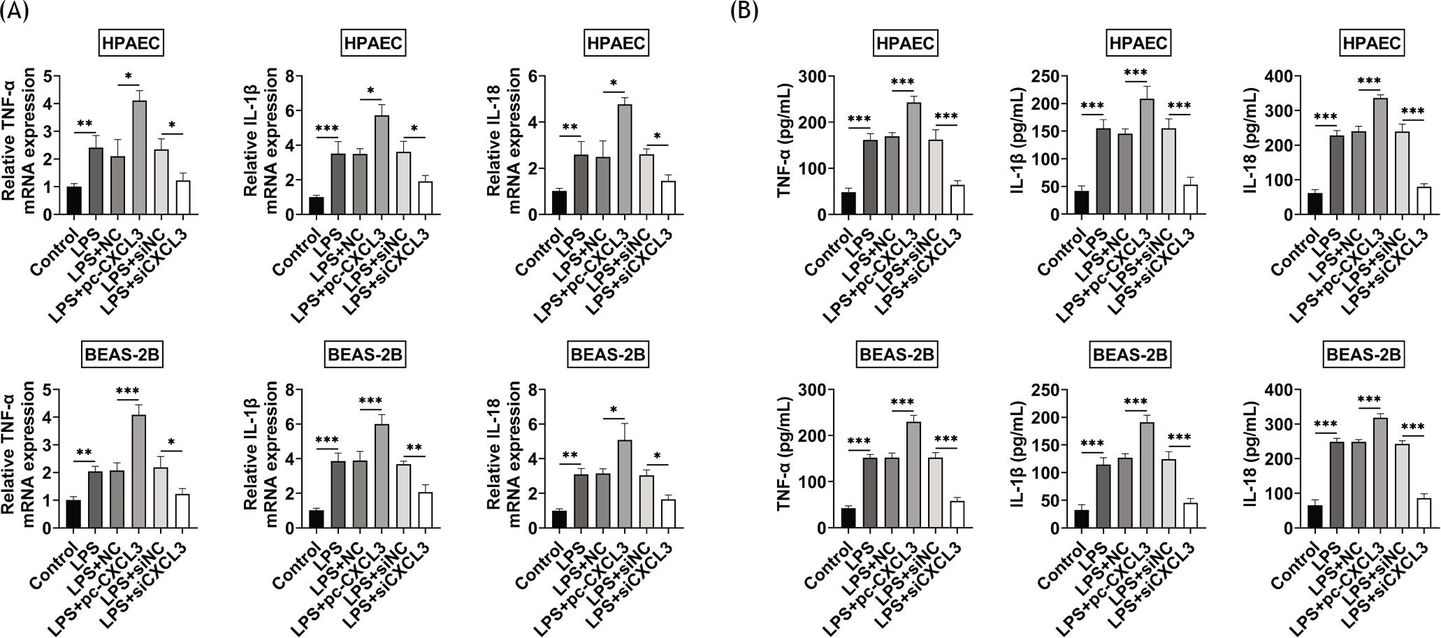 Figure 3 Knockdown of CXCL3 inhibited the inflammation of LPS-treated BEAS-2B and HPAE cell lines. (A) Overexpression of CXCL3 upregulated the mRNA expressions of TNF-α, IL-1β, and IL-18, while knockdown of CXCL3 downregulated the levels of TNF-α, IL-1β, and IL-18 in LPS-treated BEAS-2B and HPAE cells. (B) Overexpression of CXCL3 upregulated the protein expressions of TNF-α, IL-1β, and IL-18, while knockdown of CXCL3 down-regulated the levels of TNF-α, IL-1β, and IL-18 in LPS-treated BEAS-2B and HPAE cells. *, **, ***, P ˂ 0.05, P ˂ 0.01, P ˂ 0.001. BEAS-2B, human lung epithelial cells; CXCL3, C-X-C motif chemokine ligand 3; HPAEC, human pulmonary artery endothelial cells; LPS, lipopolysaccharides.