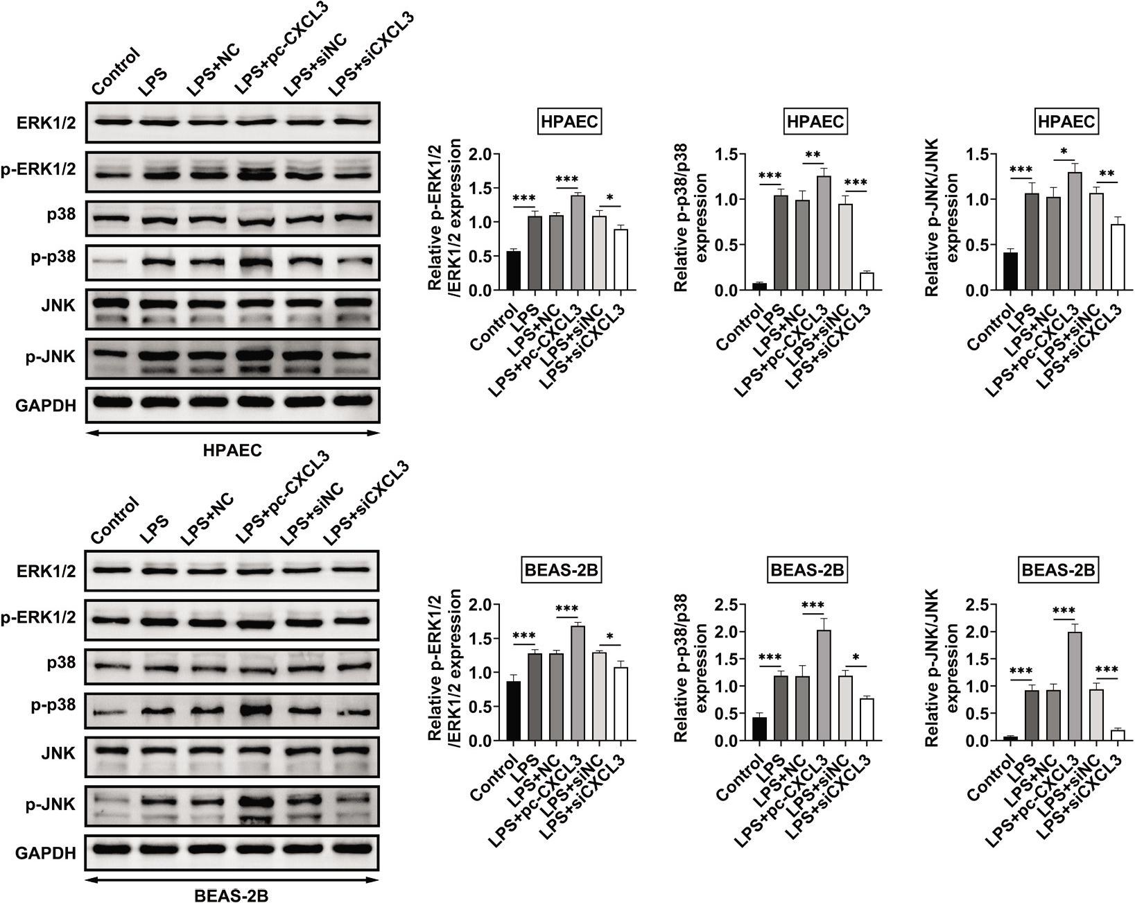 Figure 4 Knockdown of CXCL3 inhibited MAPKs signaling in LPS-treated BEAS-2B and HPAEC. Overexpression promoted the upregulation of p-ERK1/2, p-p38, and p-JNK, while knockdown of CXCL3 reduced the levels of p-ERK1/2, p-p38, and p-JNK in LPS-treated BEAS-2B and HPAE cells. *, **, ***, P ˂ 0.05, P ˂ 0.01, P ˂ 0.001. BEAS-2B, human lung epithelial cells; CXCL3, C-X-C motif chemokine ligand 3; HPAEC, human pulmonary artery endothelial cells; LPS, lipopolysaccharides; MAPKs, mitogen-activated protein kinases.