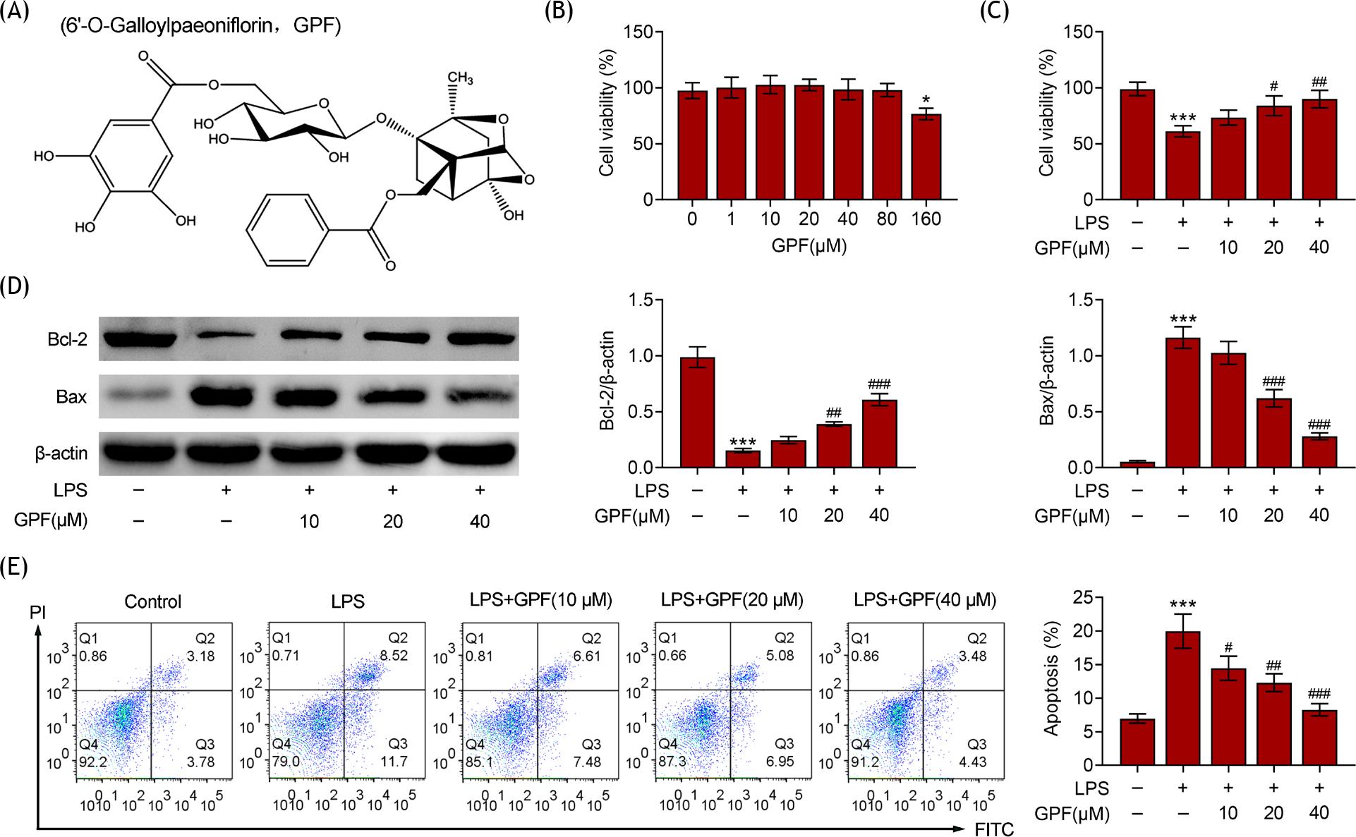 Figure 1 GPF improves LPS-induced decrease in cell viability. (A) The chemical structure of GPF. (B) Cell viability of cells treated with increasing levels of GPF in control, LPS, LPS+GPF (10 µM), LPS+GPF (20 µM), LPS+GPF (40 µM), LPS+GPF (80 µM), and LPS+GPF (160 µM). (C) Cell viability in control, LPS, LPS+GPF (10 µM), LPS+GPF (20 µM), and LPS+GPF (40 µM). (D) Expression levels of Bcl-2 and Bax in control, LPS, LPS+GPF (10 µM), LPS+GPF (20 µM), and LPS+GPF (40 µM) group. (E) Cell apoptosis as detected by flow cytometry in control, LPS, LPS+GPF (10 µM), LPS+GPF (20 µM), and LPS+GPF (40 µM) groups. ***P ˂ 0.001 vs. control; #P ˂ 0.05, ##P ˂ 0.01, and ###P ˂ 0.001 vs. LPS.