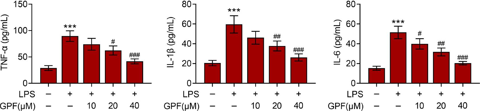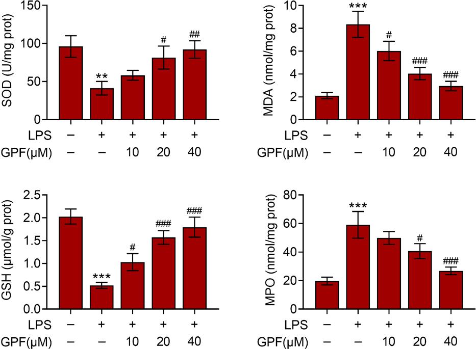 Figure 2 GPF ameliorates LPS-induced oxidative stress. Levels of SOD, MDA, GSH, and MPO in control, LPS, LPS+GPF (10 µM), LPS+GPF (20 µM), and LPS+GPF (40 µM) groups. ***P ˂ 0.001 vs. control; #P ˂ 0.05, ##P ˂ 0.01, and ###P ˂ 0.001 vs. LPS.