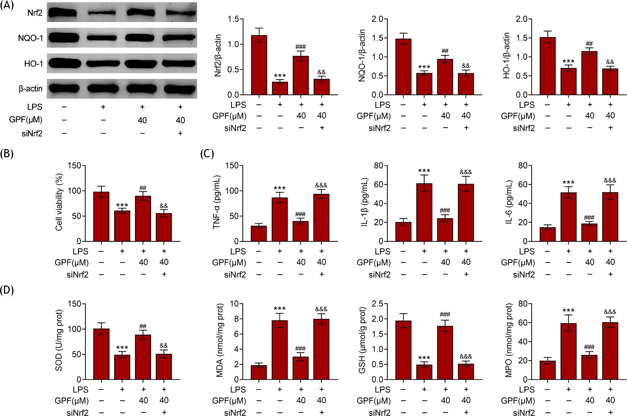 Figure 4 GPF improved the activity of Nrf2 in LPS-induced pneumonic cells. (A) Levels of Nrf2, NQO-1, and HO-1 in control, LPS, LPS+GPF (40 µM), and LPS+GPF+siNrf2 (40 µM) groups. (B) Cell viability in Control, LPS, LPS+GPF (40 µM), and LPS+GPF+siNrf2 (40 µM) groups. (C) Oxidative stress in control, LPS, LPS+GPF (40 µM), and LPS+GPF+siNrf2 (40 µM) groups. (D) Inflammation response in control, LPS, LPS+GPF (40 µM), and LPS+GPF+siNrf2 (40 µM) groups. ***P ˂ 0.001 vs. control; #P ˂ 0.05, ##P ˂ 0.01, and ###P ˂ 0.001 vs. LPS.