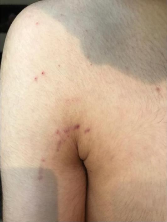 Both patients had received oral antihistamine treatment, which was not successful in relieving the cutaneous lesions and itching. On clinical examination, small red papules were found throughout their skin, especially the neck, trunk, as well as both upper and lower limbs (Figure 1).
