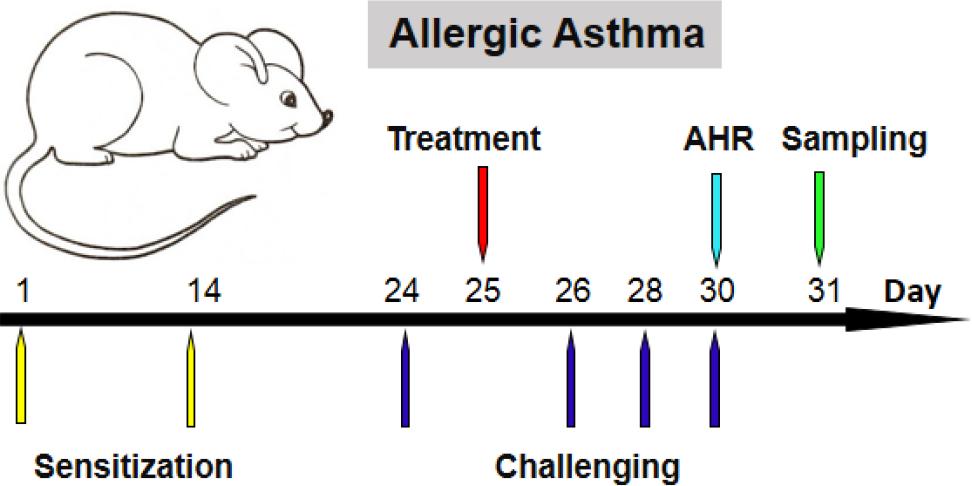 On day 30, the Methacholine (MCh) challenge test was done to determine the Penh value and assess AHR4,10 under anesthetization with ketamine and xylazine. The mice were initially exposed to PBS aerosol and different MCh concentrations (1, 5, 10, 15, 20, 25, and 30 mg/mL).