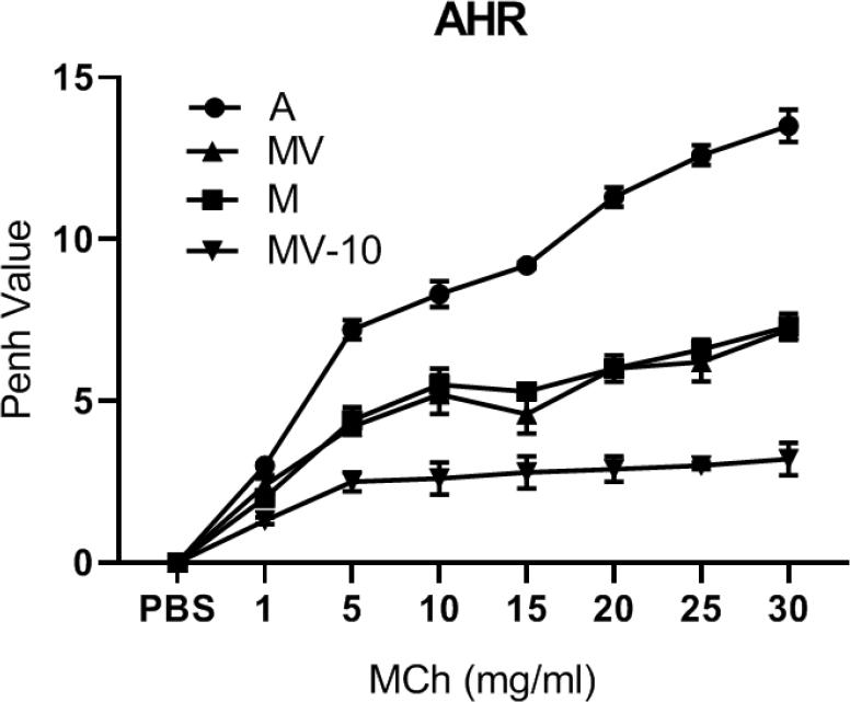 Figure 2 MCh challenge test was done on day 30 to assess AHR. The Penh value in the asthma group was increased in response to MCh, and treatments with M, MV, and MV-10 could decrease the Penh value in all MCh concentrations.