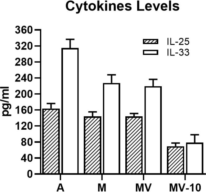 IL-25 and IL-33 levels in BALf of the asthma group (163.6 ± 12.6 and 314.8 ± 21.5 pg/mL, respectively) were decreased by treatment in M (144.1 ± 11.2 and 227.4 ± 20.4 pg/mL, respectively), MV (143.9 ± 7.5 and 219.3 ± 17.3 pg/mL, respectively), and MV-10 (69.3 ± 8.3 and 78.3 ± 19.9 pg/mL, respectively) groups (Figure 3). Decreasing of the IL-25 was significant (p ˂ 0.05) in the MV-10 group compared with the asthma group and decreasing of the IL-33 was significant (p ˂ 0.05) in all three treated groups compared with the asthma group.