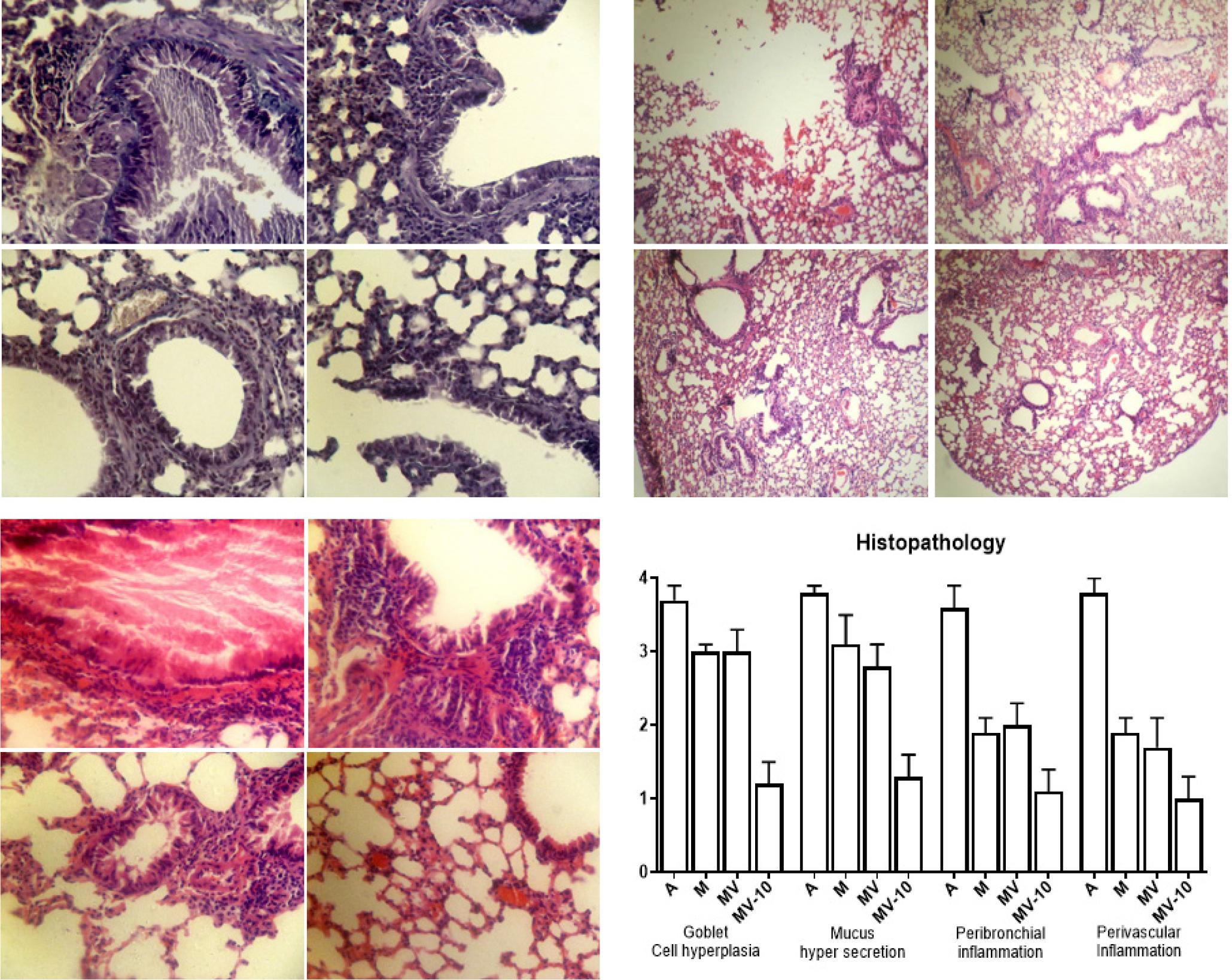 Inflammation around the bronchi and vessels, hyperplasia of the goblet cell, and secretion of mucus to the airways were decreased significantly (p ˂ 0.05) in M, MV, and MV-10 groups compared with the nontreated asthma group (Figure 4). Inflammation around the bronchi, hyperplasia of the goblet cell, and secretion of mucus were significantly decreased in the MV-10 group compared to M and MV groups. Decreasing of perivascular inflammation in MV-10 compared to M and MV groups was not significant (p ˃ 0.05).
