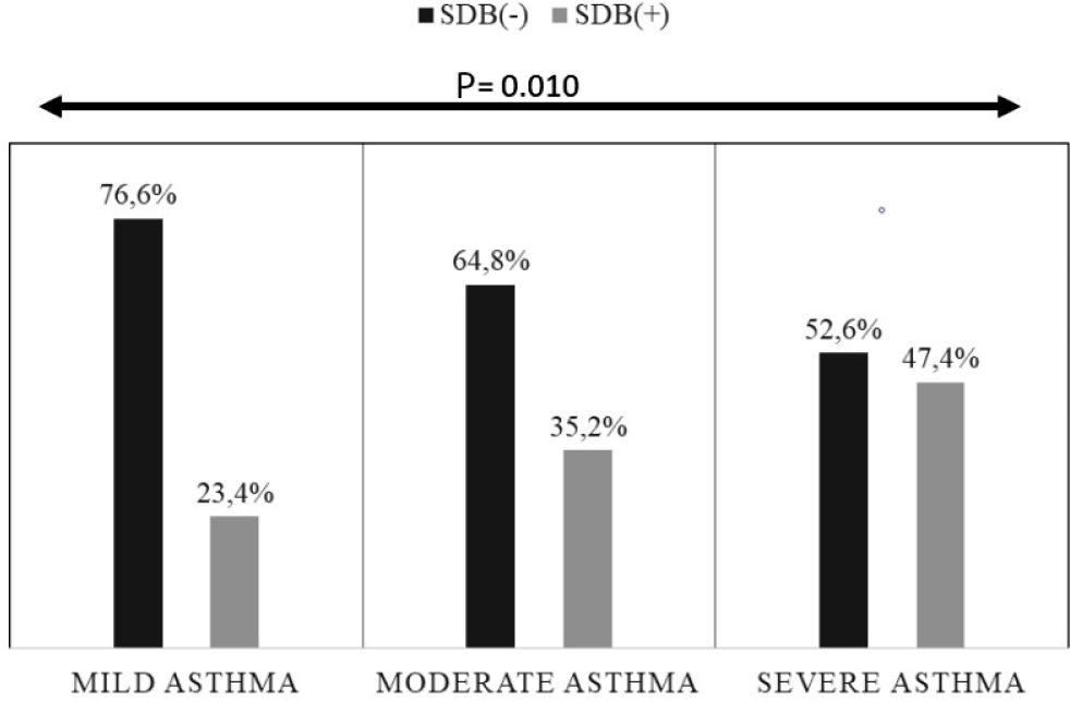 The frequency of uncontrolled disease was significantly higher in asthmatic patients with SDB (74.3% vs 49.4%; P < 0.001; Table 3). The frequency of steroid use and hospitalization of the patients within the past 1 year was not statistically different. However, the number of attacks and emergency room admissions within the past 1 year was significantly higher in the group with SDB (P = 0.035 and 0.004, respectively). When the patients were classified according to the severity of their asthma as having mild, moderate, and severe asthma, the prevalance of SDB was 23.4%, 35.2%, and 47.4%, respectively (P = 0.010; Table 3 and Figure 1).