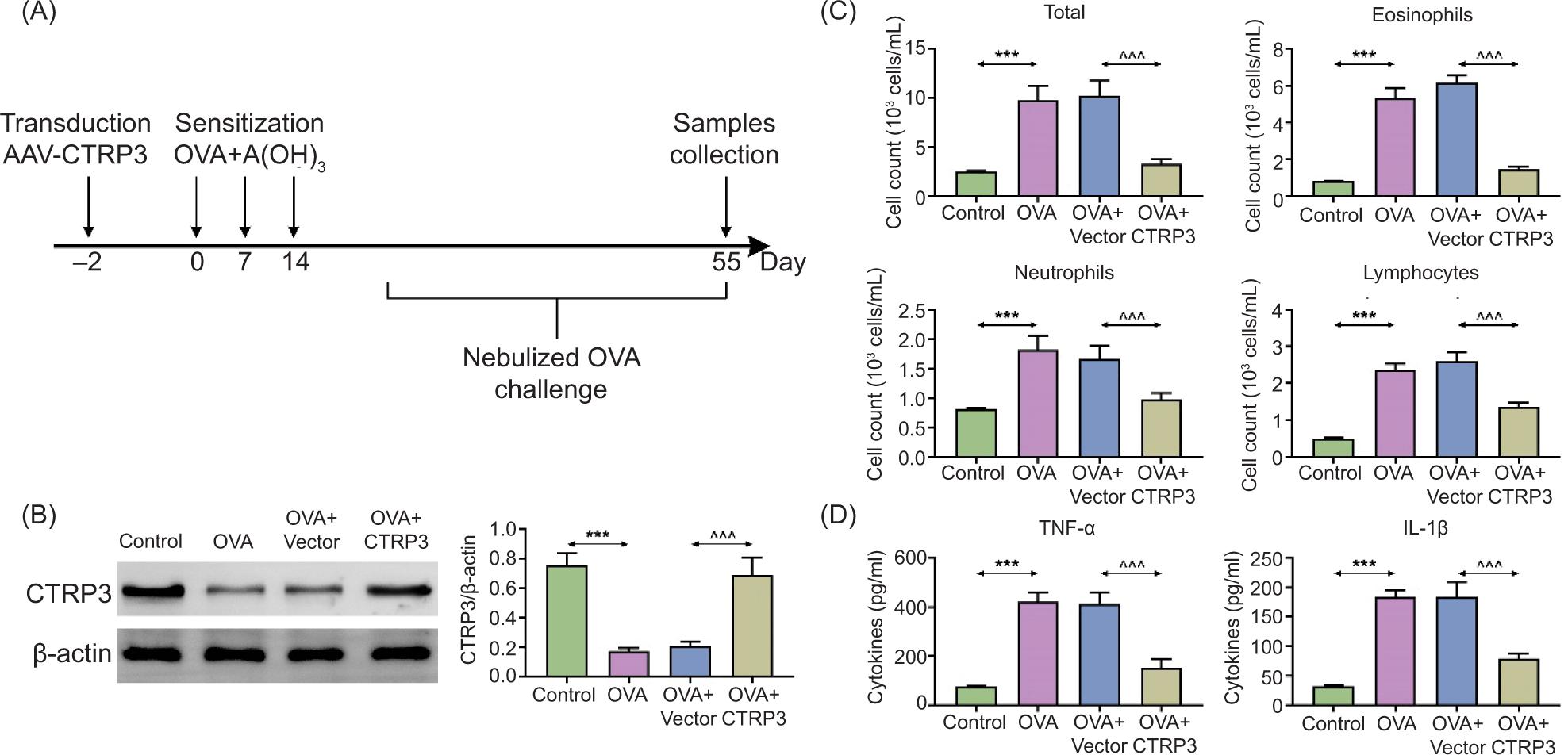 Figure 1 Upregulation of CTRP3 diminished inflammation of asthmatic airway in OVA-stimulated mice. The BALB/c mice were randomly divided into four groups: control, OVA, OVA+vector, and OVA+CTRP3. (A) The sensitization flow chart of mice. (B) The content of CTRP3 in lung tissues was examined by Western blot analysis. (C) The quantity of total cells, including eosinophils, neutrophils, and lymphocytes, in BALF was assessed by utilizing a hemocytometer. (D) The contents of TNF-α and IL-1β in BALF were examined by ELISA. Compared to the control group, ***P < 0.001; compared to the OVA+vector group, ^^^P < 0.001. All data were expressed as mean ± SD.