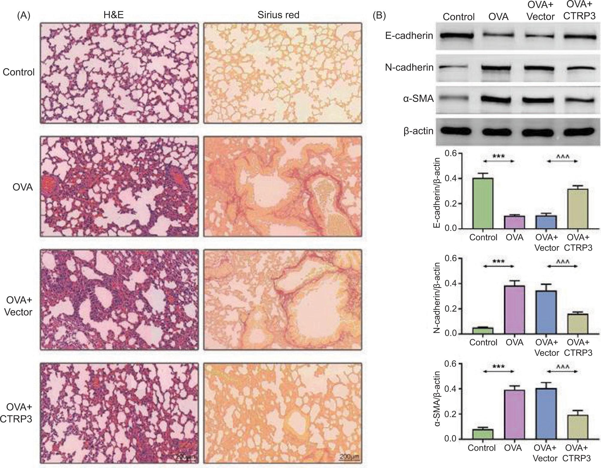 Figure 3 CTRP3 restricted OVA-induced airway remodeling. (A) The bronchial and alveolar structures were assessed by H&E staining and sirius red staining (×200). (B) Levels of E-cadherin, N-cadherin, and α-SMA were examined by Western blot analysis. Compared to the control group, ***P < 0.001; compared to the OVA+vector group, ^^^P < 0.001. All data were expressed as mean ± SD.