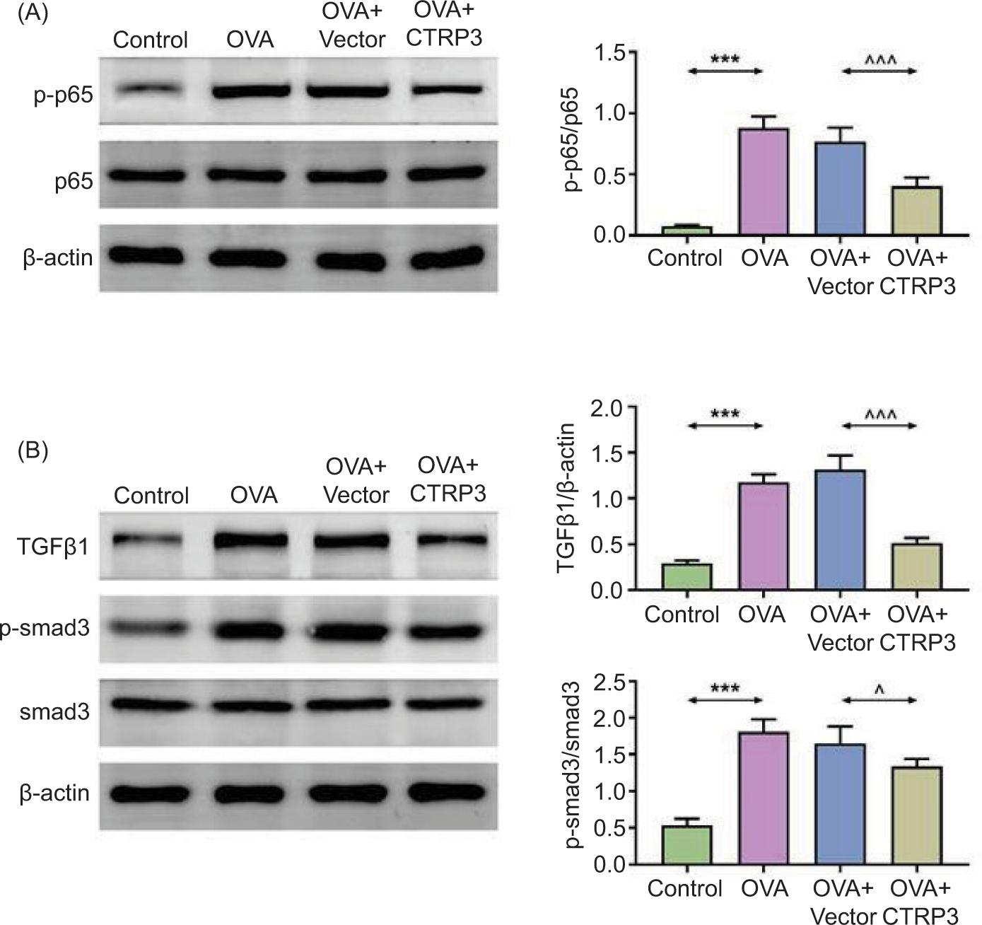 Figure 4 CTRP3 modulated NF-κB and TGFβ1/Smad3 pathways in OVA-stimulated mice. (A) and (B) The contents of p-p65/p65, TGFβ1, and p-Smad3/Smad3 in lung tissues were examined by Western blot analysis. Compared to the control group, ***P < 0.001; compared to the OVA+vector group, ^P < 0.05, ^^^P < 0.001. All data were expressed as mean ± SD.