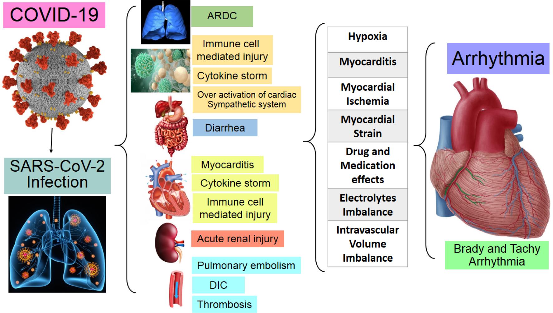 Figure 2 Effect of the storm of cytokines on the targeted organs and mechanism of arrhythmia on COVID-19.