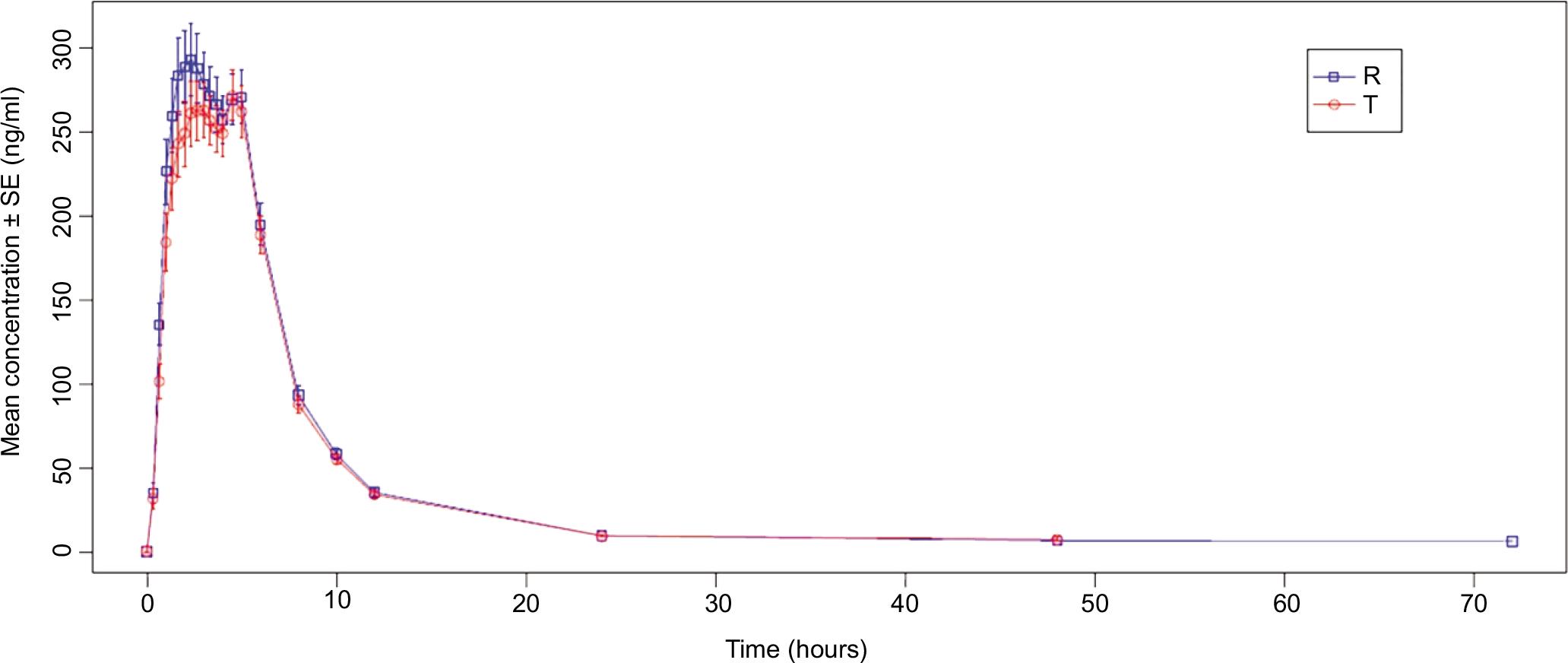 Figure 2 Mean concentrations of montelukast after administration of the test and reference products. R, reference; T, test.