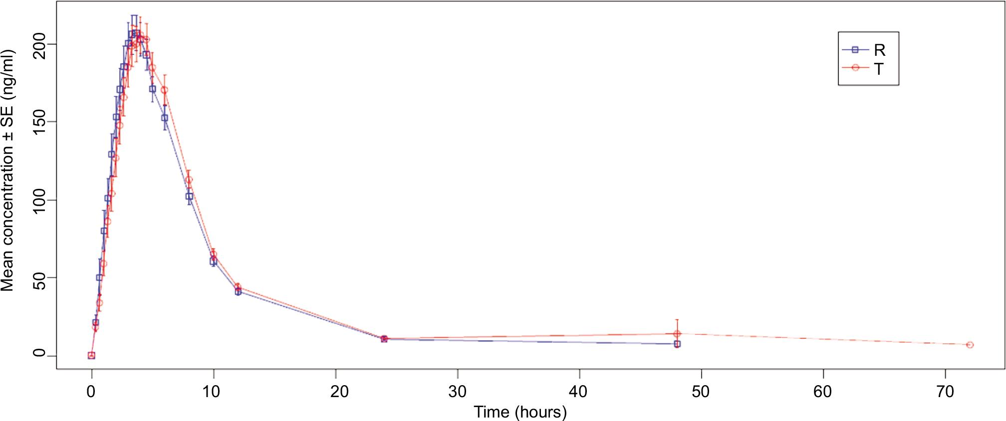 The pharmacokinetic parameters were determined with Phoenix WinNonlin 8.1 software. The range for acceptance of bioequivalence for both substances is 80% to 125% (90% confidence intervals [CI] of the geometric means of the T/R ratios for the Cmax and AUC0-t after logarithmic transformation).
