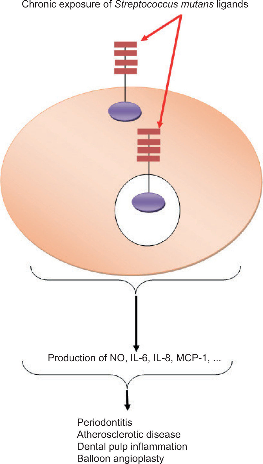 Figure 1 The roles played by TLRs in the induction of inflammation during chronic inflammation with Streptococcus mutans. The figure illustrates that chronic exposure of S. mutans antigens to both cell surface and intra-vesicular TLRs can be associated with expression of pro-inflammatory molecules, which the main responsible factors for inflammation induction and its-related disorders.