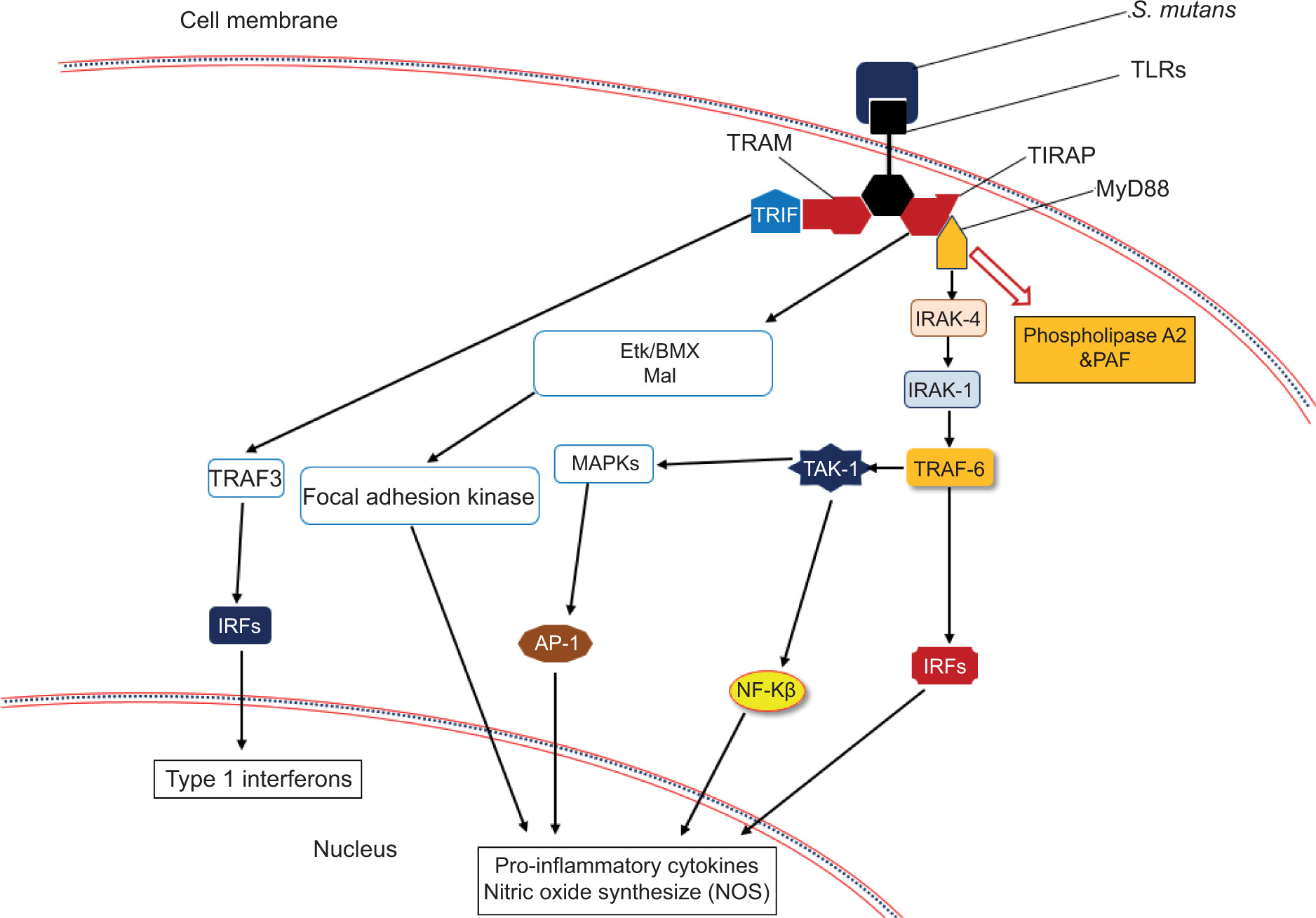 Figure 2 The molecular mechanisms used by TLRs in the pathogenesis of S. mutans. TLRs use Myd88 and TRIF-dependent pathways to activate transcription factors to transcript from pro-inflammatory cytokines, and nitric oxide synthesize (NOS) and type 1 interferons. TLRs also induce the production of phospholipase A2 and PAF to induce inflammation in dependent of S. mutans.