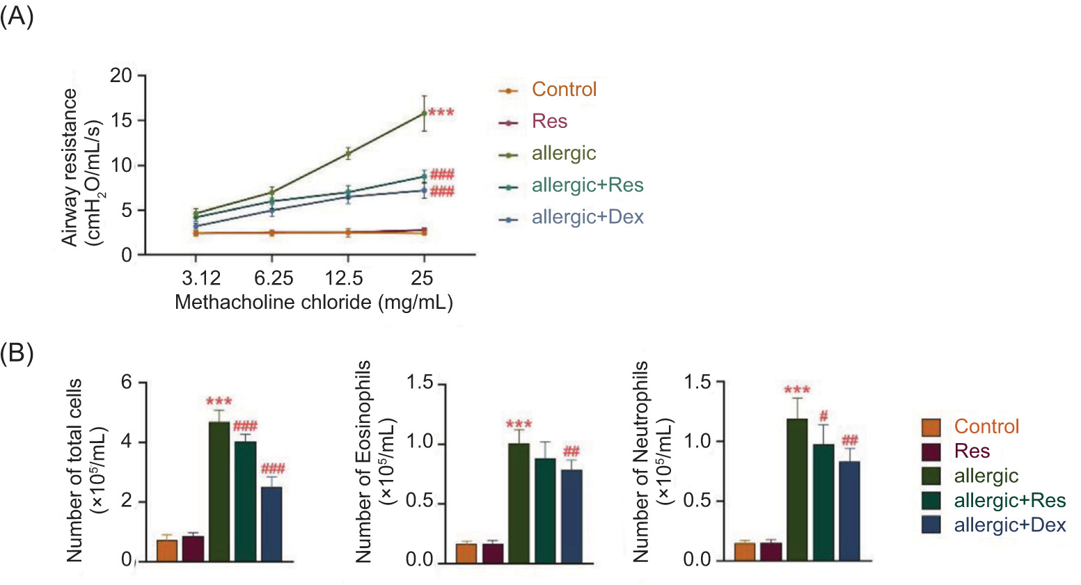 Figure 1 Resveratrol decreases airway resistance and inflammatory cells in allergic mice. (A) Airway resistance was detected by pulmonary function apparatus. (B) The number of total cells, neutrophils, and eosinophils in BALF were observed using an automated blood cell analyzer. The data are expressed as mean ± SD. ***P < 0.001 vs. the control. ###P < 0.001 vs. the allergic group.