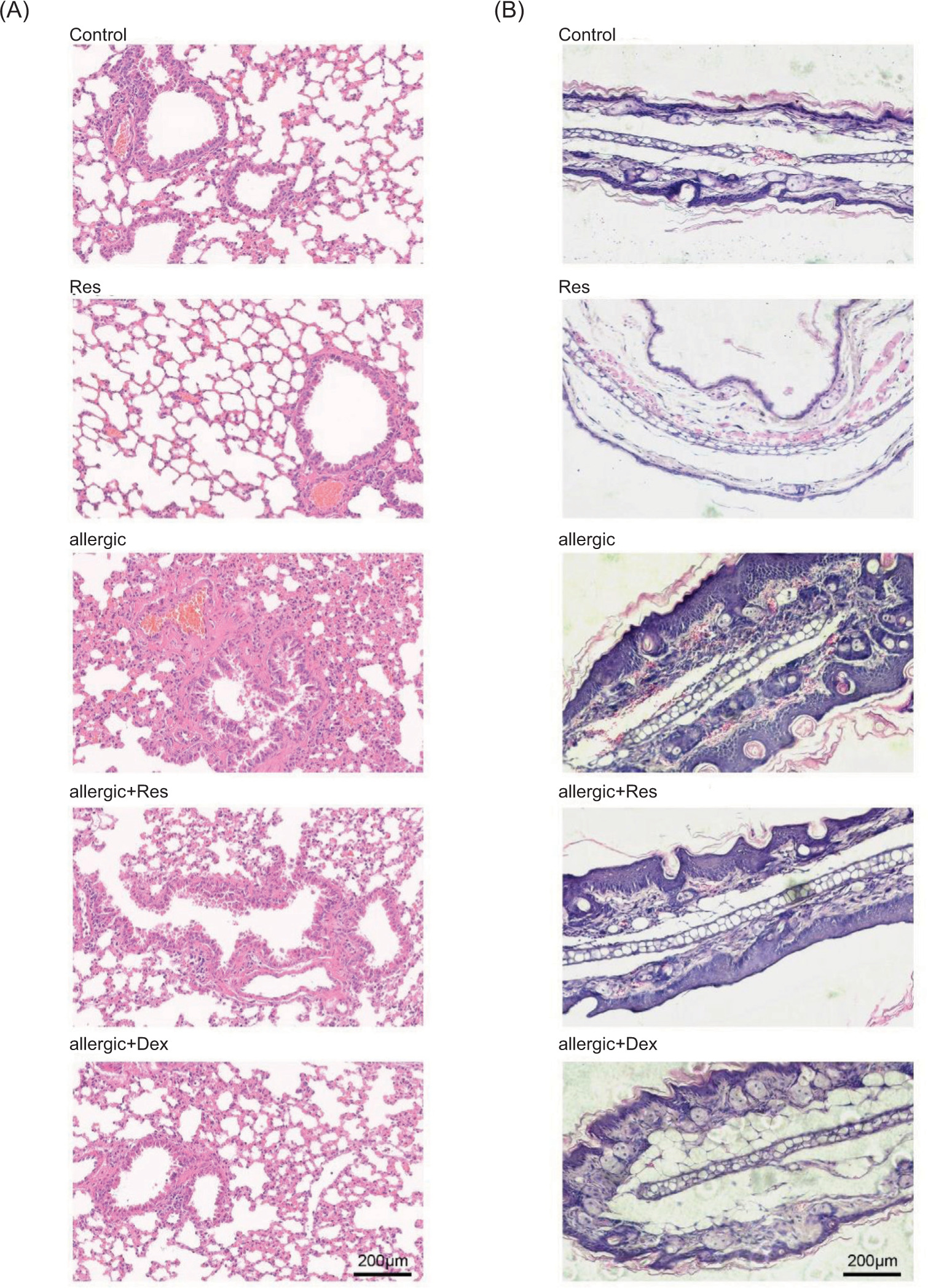 Figure 2 Resveratrol ameliorates histopathological alterations in lung and skin tissues of allergic mice. (A) Lung tissues were measured by H&E staining (magnification, ×200). (B) Epidermal and dermal thicknesses were determined from H&E-stained ear sections (magnification, ×200). The data are expressed as mean ± SD.