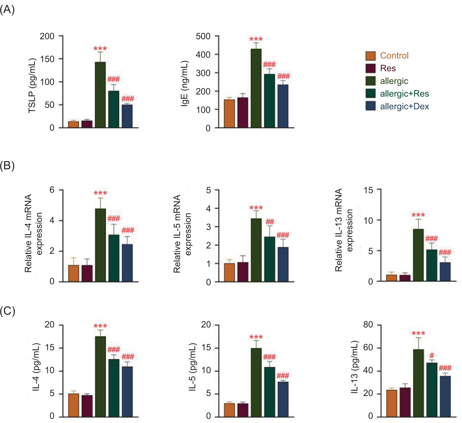 Figure 3 Resveratrol ameliorates serum inflammatory markers in allergic mice. (A) TSLP and IgE were observed in the serum. (B) The mRNA levels of IL-4, IL-5, and IL-13 were measured by PCR. (C) The protein levels of IL-4, IL-5, and IL-13 were measured by enzyme-linked-immunosorbent serologic assay (ELISA). The data are expressed as mean ± SD. ***P < 0.001 vs. the control. ###P < 0.001 vs. the allergic group.