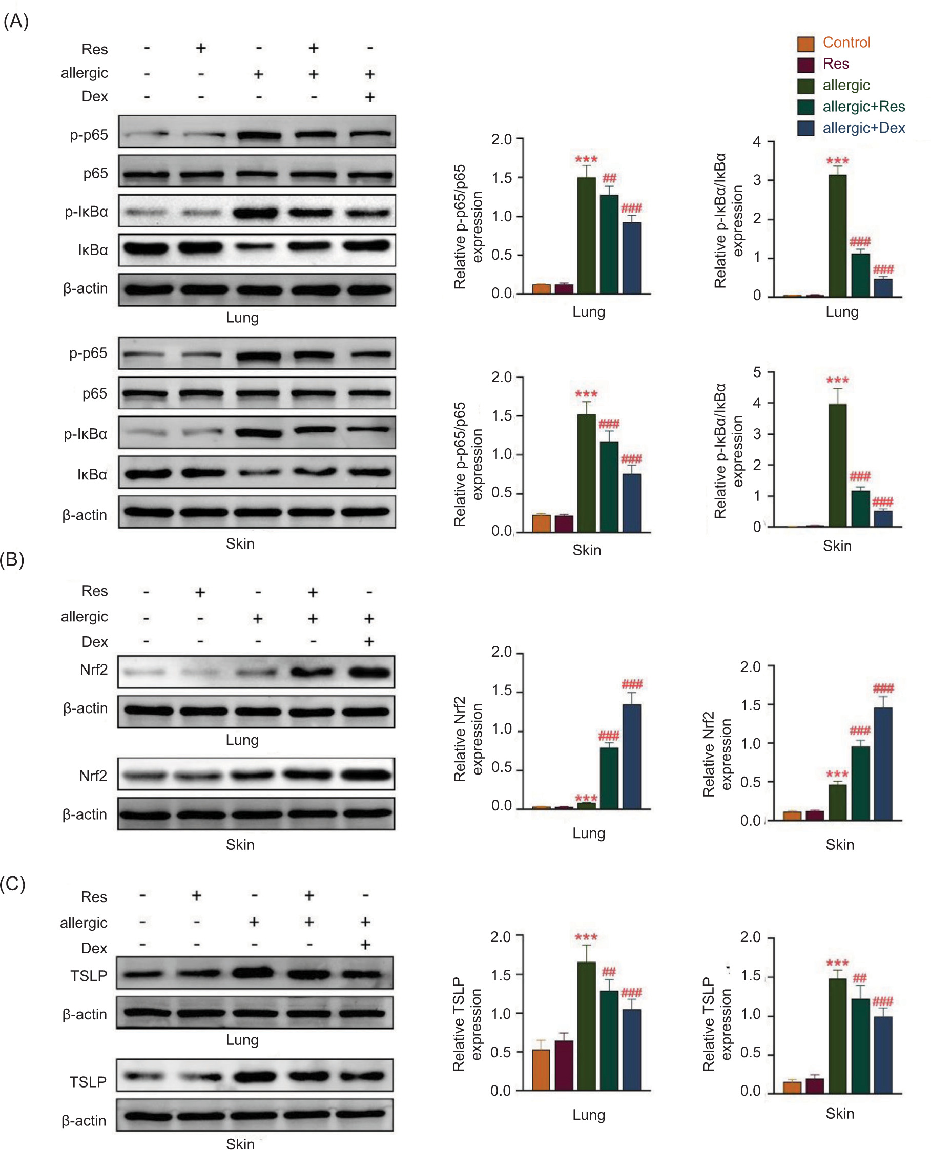 Figure 4 Resveratrol modulates NF-κB and Nrf2 pathway. (A) The protein expressions of p-p65, p65, p-IκBα, and IκBα in lung and ear skin tissues were assessed by Western blot analysis. (B) Nrf2 levels in lung and ear skin tissues were measured by Western blot analysis. (C) The protein level of TSLP was discovered by Western blot analysis. The data are expressed as mean ± SD. ***P < 0.001 vs. the control. ##P < 0.01 and ###P < 0.001 vs. the allergic group.