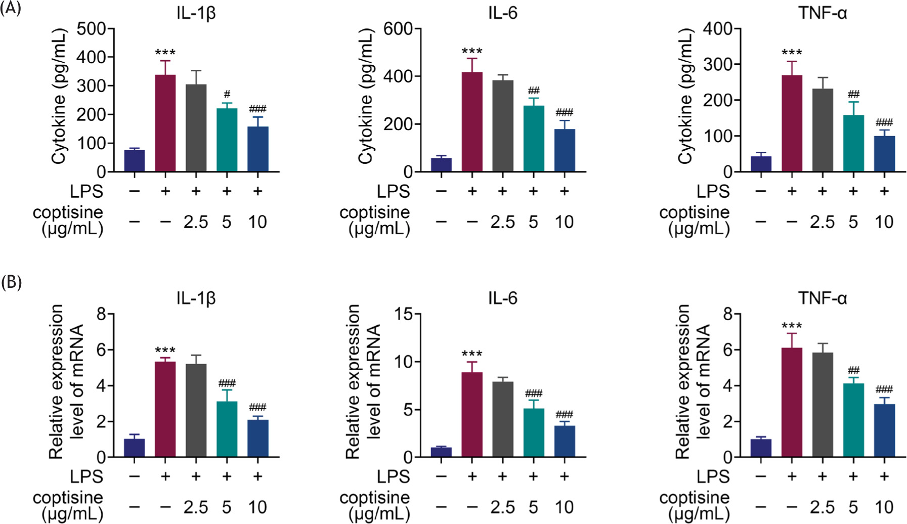 Figure 2 Effect of coptisine on cell inflammation induced by LPS. (A) TNF-α, IL-6, and IL-1β release discovered by ELISA. (B) The relative mRNA levels of TNF-α, IL-6, and IL-1β discovered by RT-qPCR. ***P < 0.001, compared to MLE-12 cells without LPS stimulation and coptisine treatment. #P < 0.05, compared to MLE-12 cells simulated with 1-μg/mL LPS for 24 h but without coptisine treatment. ##P < 0.01, compared to MLE-12 cells simulated with 1-μg/mL LPS for 24 h but without coptisine treatment