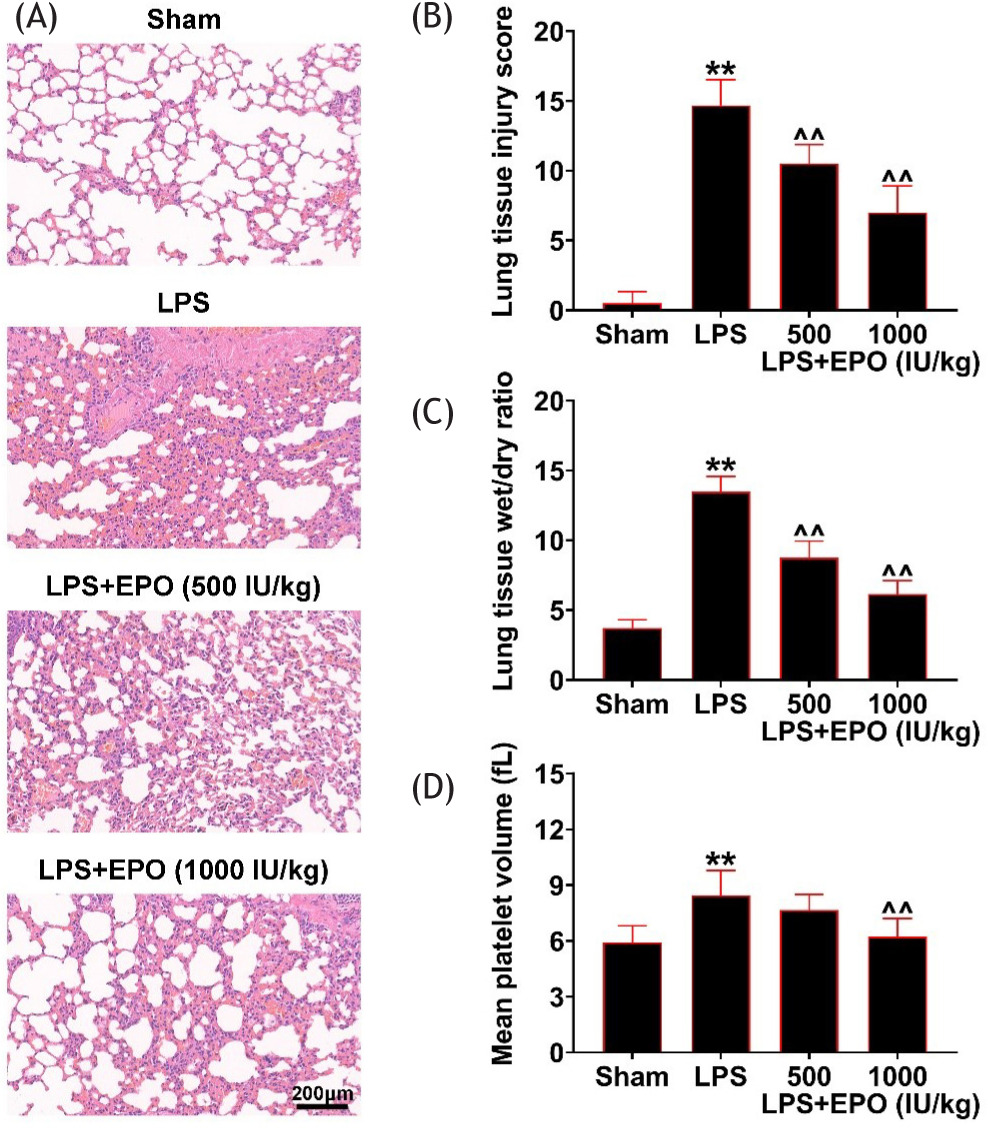 Figure 1 EPO alleviated LPS-induced lung injury. (a) The histological analysis of lung tissues in control, LPS, EPO (500 IU/kg)-treated LPS, and EPO (1000 IU/kg)-treated LPS mice. The H&E staining was performed. Scale bar: 200 um. (b) Lung tissue injury score in control, LPS, EPO (500 IU/kg)-treated LPS, and EPO (1000 IU/kg)-treated LPS mice. (c) Lung tissue wet/dry ratio and (d) mean platelet volume in mice of control, LPS, EPO (500 IU/kg)-treated LPS, and EPO (1000 IU/kg)-treated LPS groups. **P < 0.01 vs. control; ^^P < 0.01 vs. LPS