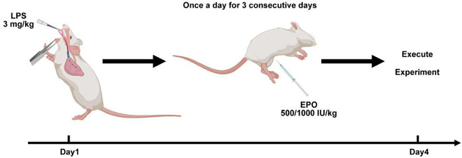 Male C57BL/6 mice (aged about 8 weeks) were accessed from the SLAC (Shanghai, China). The mice were kept in sterile atmosphere. All experimental procedures in this study were conducted under ethical approval obtained from the Institutional Animal Care and Use Committee of Nanjing BenQ Medical Center, The Affiliated BenQ Hospital of Nanjing Medical University (Approval No. SYXK-2020-0022). The mice were sacrificed by cervical dislocation, and the lack of heartbeat was confirmed to validate death. The mice were monitored once a day before the experiment began and twice a day until the experiment ended. The mice were anesthetized by injection of 4% chloral hydrate and instilled with 3-mg/kg LPS (Escherichia coli 0111:B4; Sigma, St. Louis, MO, US) dissolved in 50-μL phosphate-buffered saline (PBS) or only sterile PBS (control group). EPO (1248200; Sigma) was administered by oral gavage 1 h after LPS treatment as follows: bronchoalveolar lavage fluid (BALF) and lung tissues were collected to monitor pathological changes and production of cytokines. The total number of cells and neutrophils were observed in BALF.